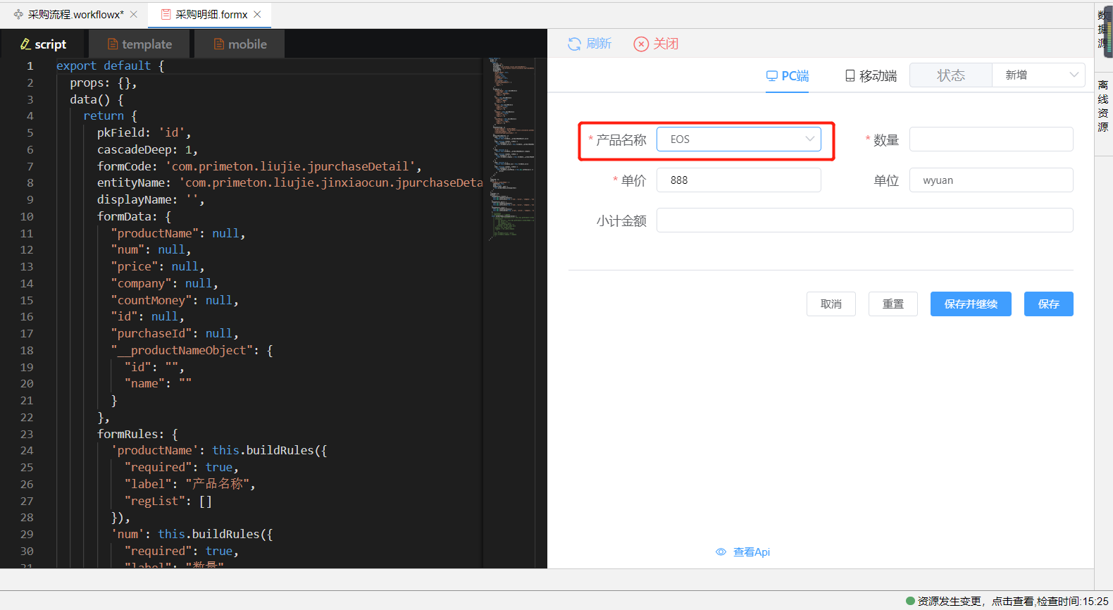 同时在当前表单生成一个系统对象__productNameObject,可为单价和单位组件设置默认值,该默认值就为这个系统对象中的单价和单位字段值。