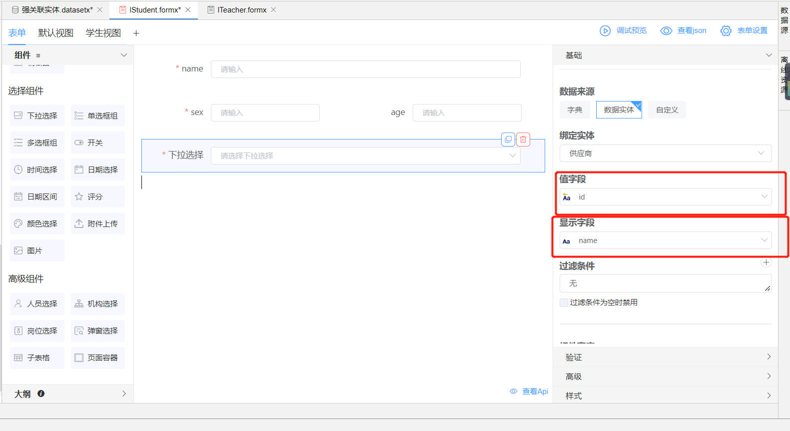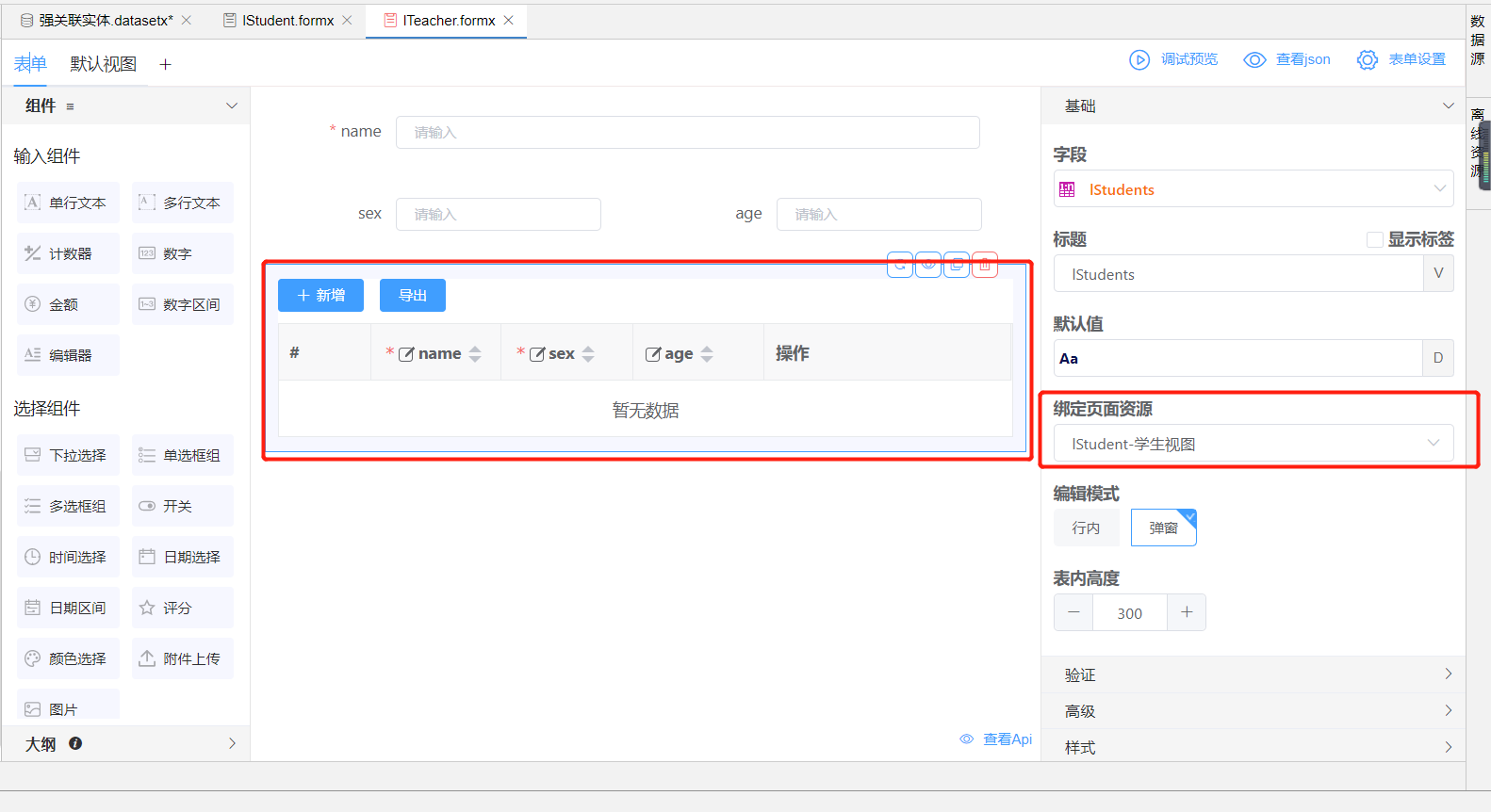 同时在IStudent实体中每条数据都会加载Iteacher的关联实体,在IStudent的视图中,可以添加绑定Iteacher的列字段,如下图为教师名称绑定列名ITeacher.name字段,这样每条IStudent数据都可以展示关联的ITeacher信息。