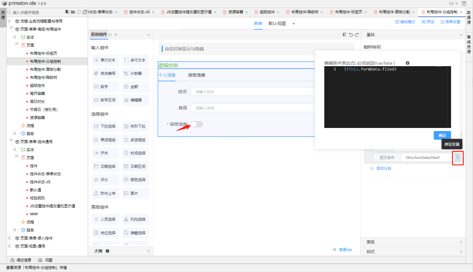 3.也可使用布局组件标签页进行控制标签页内的组件的显示与隐藏,输入显示条件,即可根据返回值true/false来进行组件的显示与隐藏。