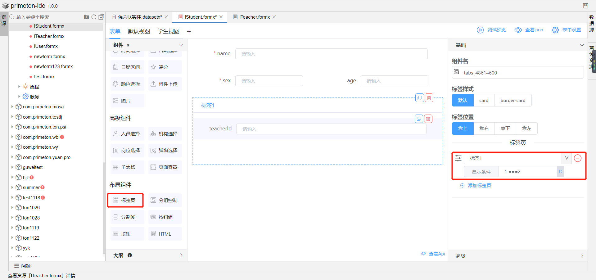 2.在主表单中拖进两个页面容器组件与一个标签页组件,两个页面容器分别绑定刚刚创建的男教师视图与女教师视图;在标签页组件基础属性中新增一个标签页,将两个标签页改名为男教师与女教师;分别将两个页面容器拖入对应标签页中。