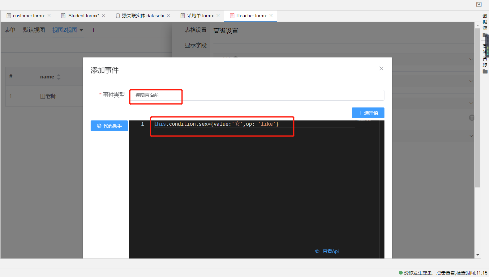 1.新增教师视图为女教师视图,将默认教师视图作为男教师视图,在男教师视图中找到视图设置=》高级设置=》新增视图查询前事件,编写视图默认查询条件根据性别值为男来查询数据的js代码如下: