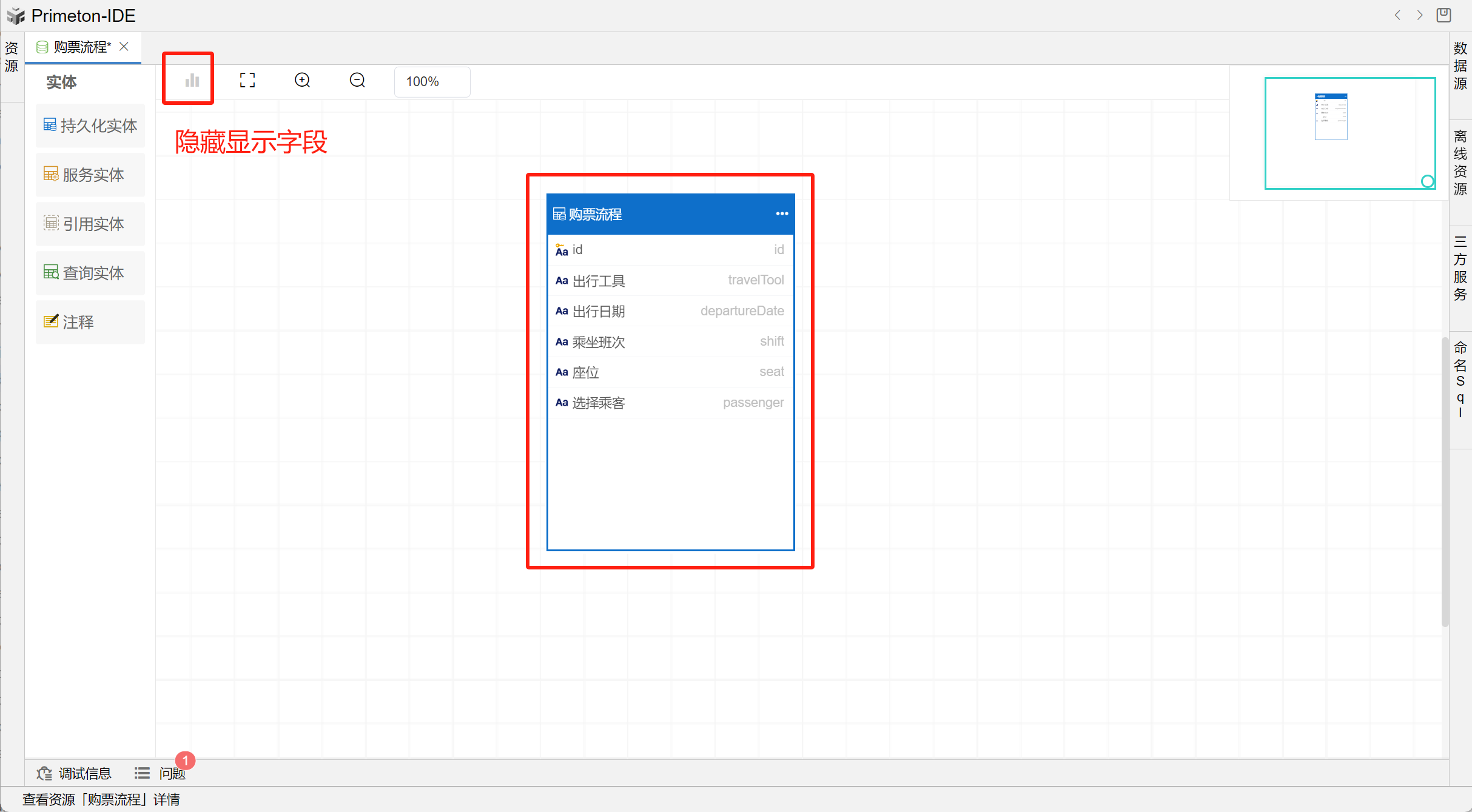 实体界面主要分为4部分:资源树菜单,实体面板,数据源,toolbar。