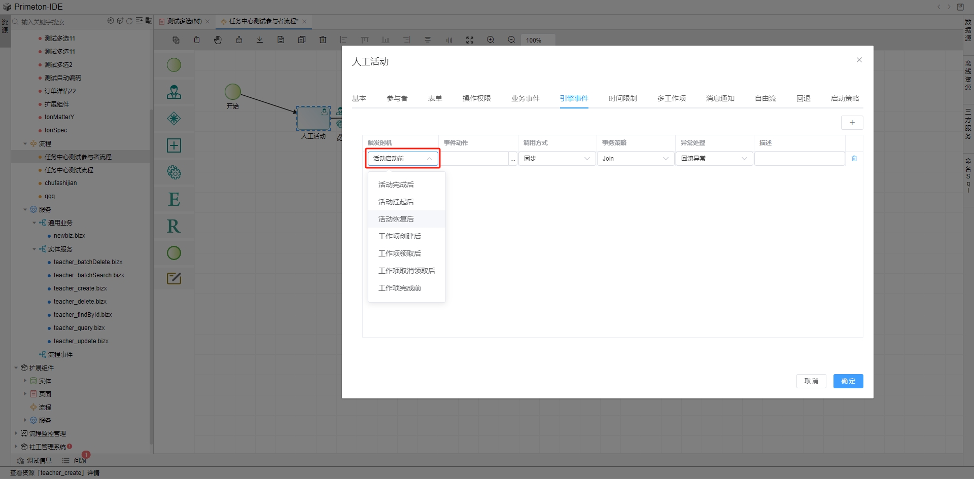 以人工活动配置为例,在引擎事件tab页即可设置触发事件。