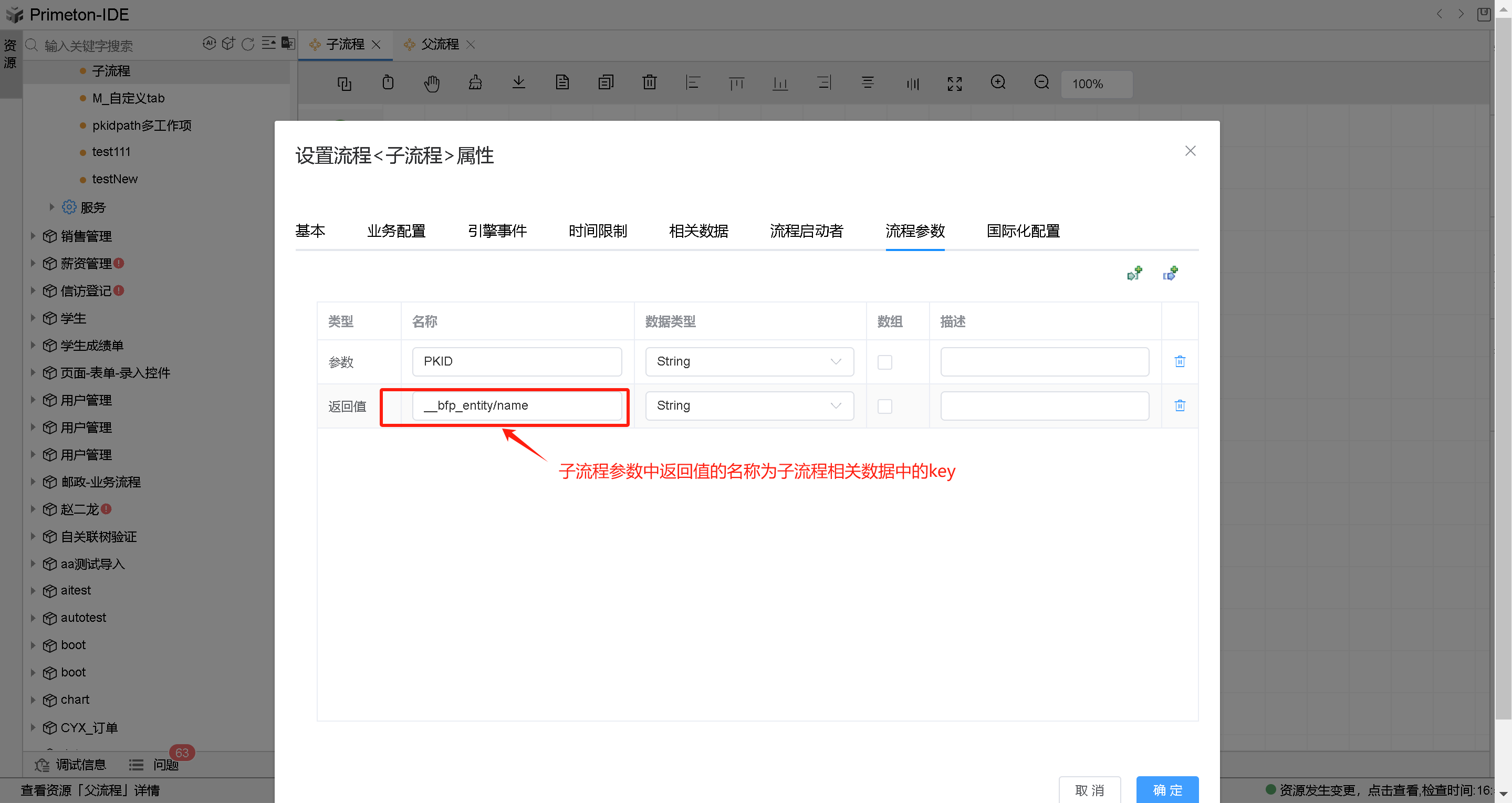 子流程参数的定义用于将父流程中指定的相关数据进行主子流程之间传递,流程参数中可进行添加参数和添加返回值。