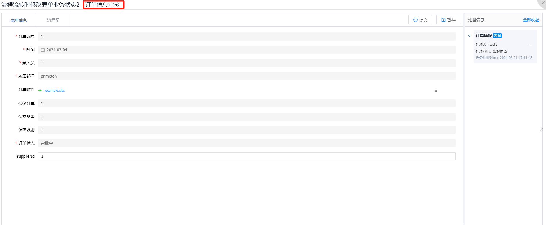 以下图订单审批流程为例,在"订单填报"、"订单信息审核"环节,实现业务表单中"状态"值为"未审批"、"已审批"的自动更新。