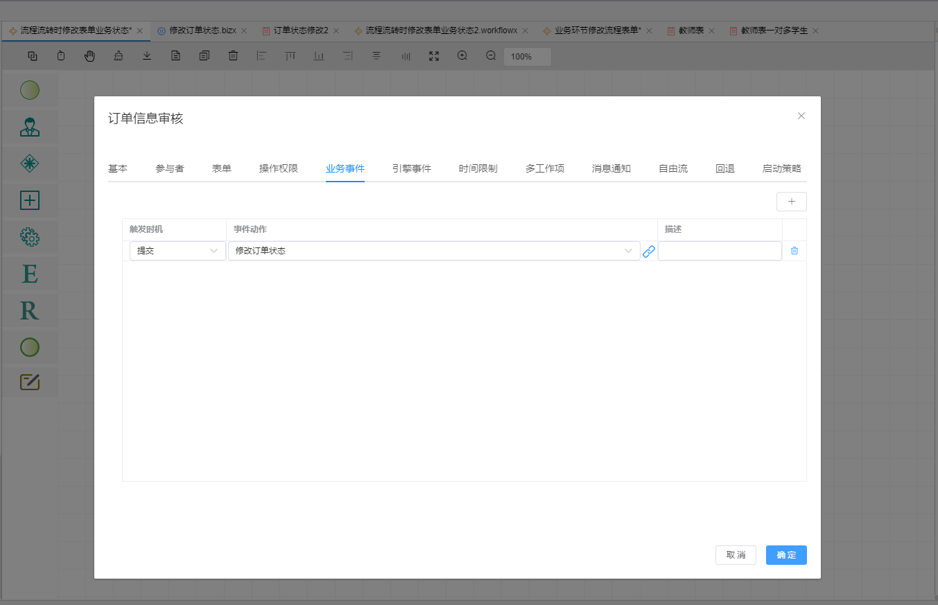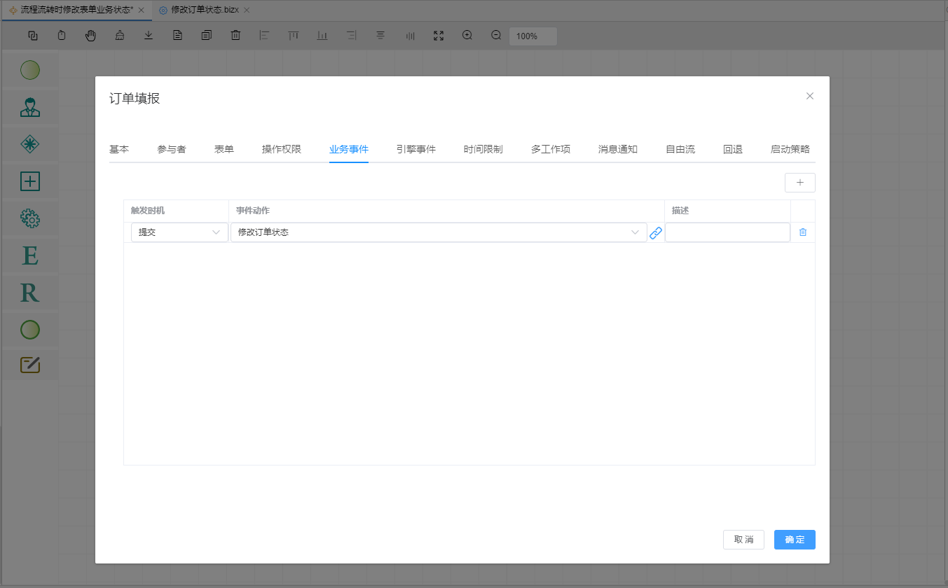 - 在订单填报与订单信息审核节点分别双击图元,选择业务事件tab页,新增业务事件,触发时机选择提交(提交:流程按钮事件,表示在提交流程时触发调用逻辑流的事件),事件动作绑定我们刚刚创建的逻辑流即可,保存后完成流程流转时修改表单业务状态场景配置。