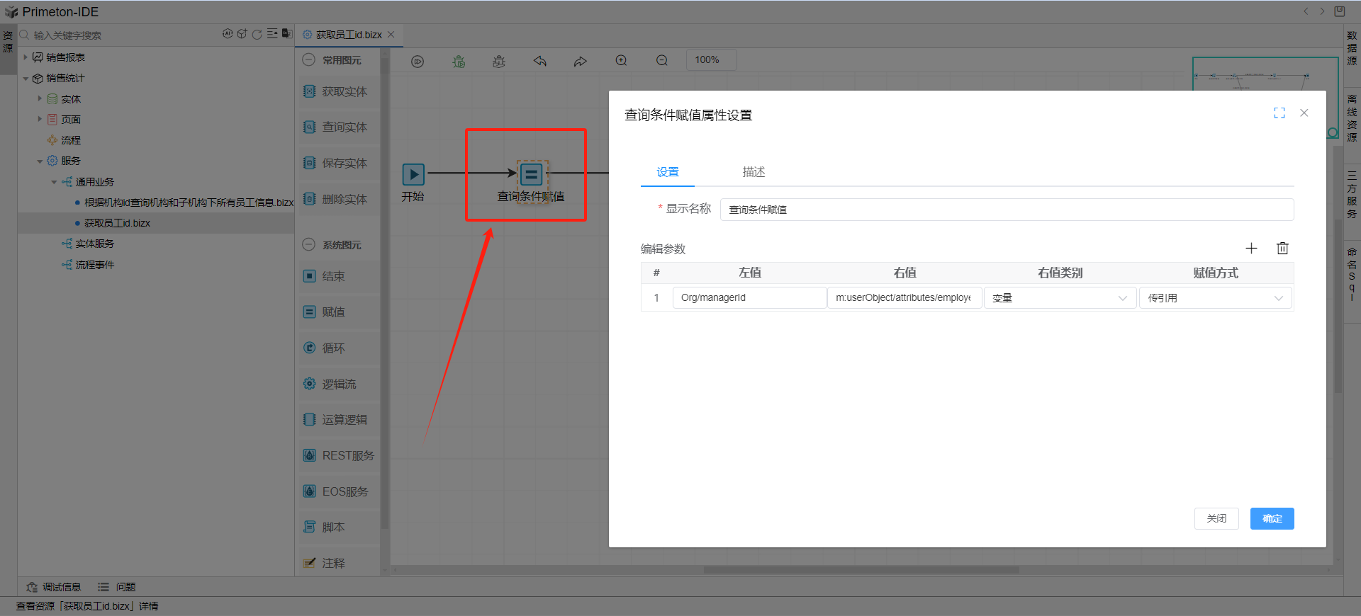 连接一个赋值图元,把当前登录用户的员工id赋值给查询条件中的负责人id,左值:Org/managerId,右值:m:userObject/attributes/employeeId,右值类别:变量,赋值方式:传引用。