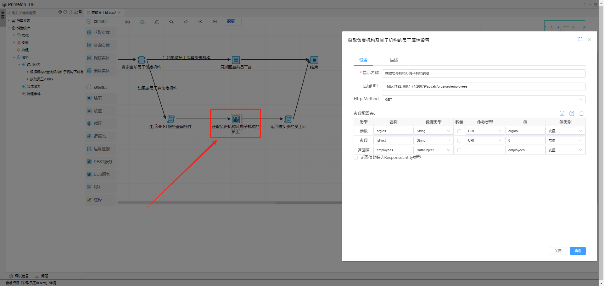 添加一个REST服务图元,获取机构及其子机构下的所有员工,该逻辑流最终根据传入的orgIds参数,获取orgIds中,每个机构id对应的机构和其子机构下所有员工。