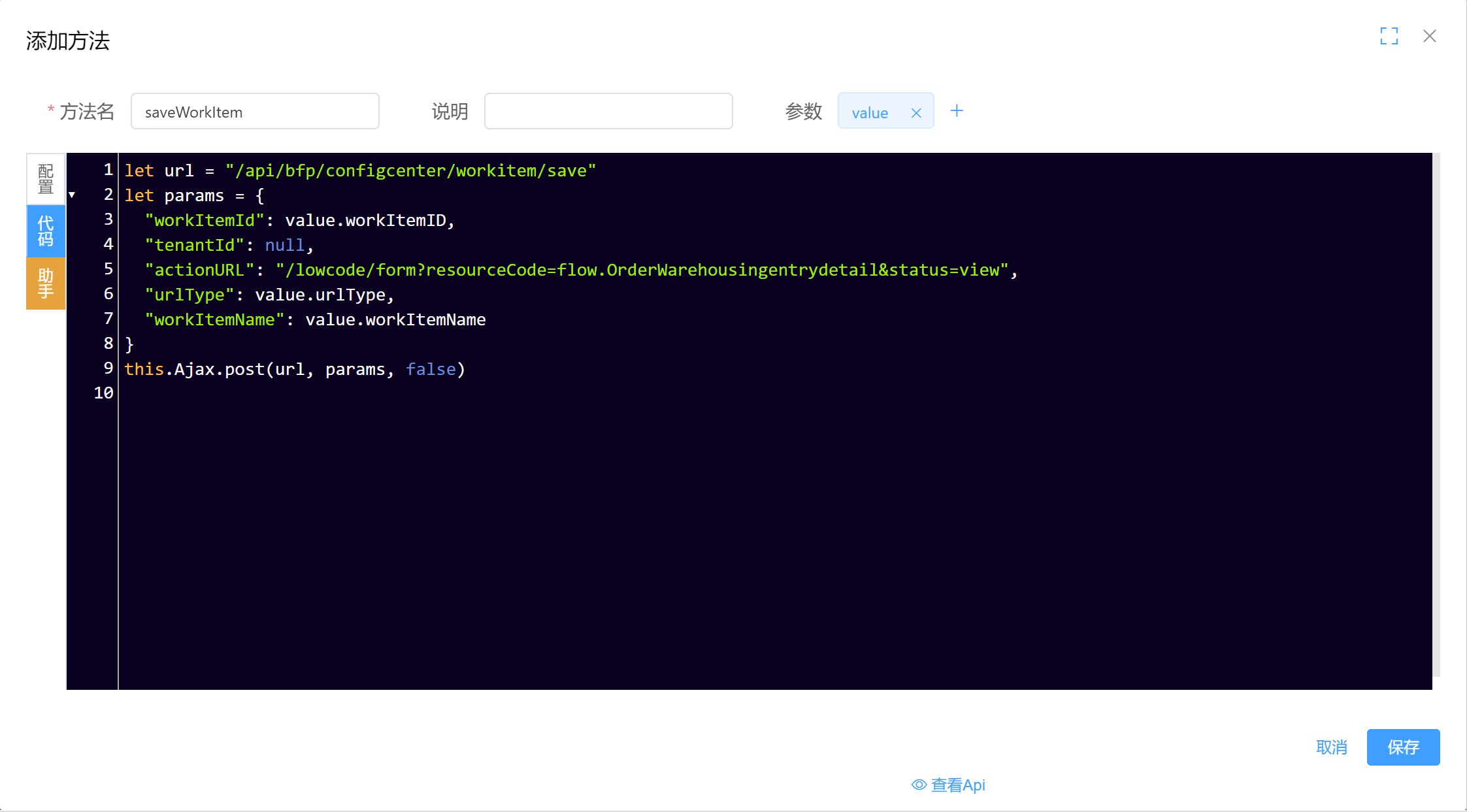 在订单详情流程表单-表单设置-高级设置-添加方法,方法名:saveWorkItem,通过AJAX的POST请求方式,向服务器发送数据以更新并保存某个工作项的配置信息: