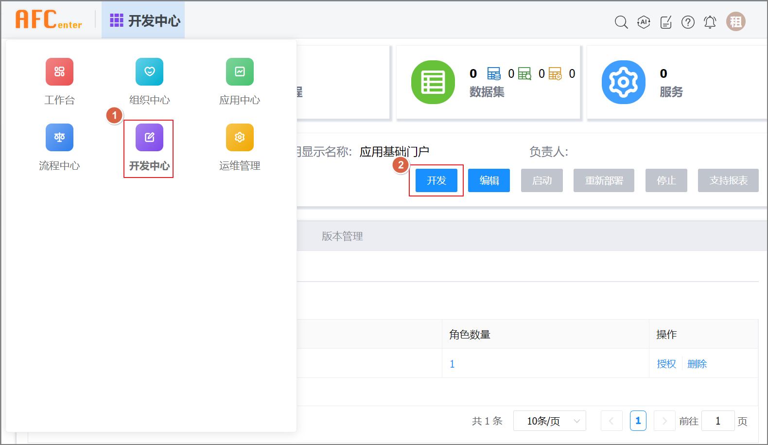 启动EOS后,在页面上方单击开发中心选项卡,找到需要开发的应用,再点击该应用的开发按键,进入低开开发页面。