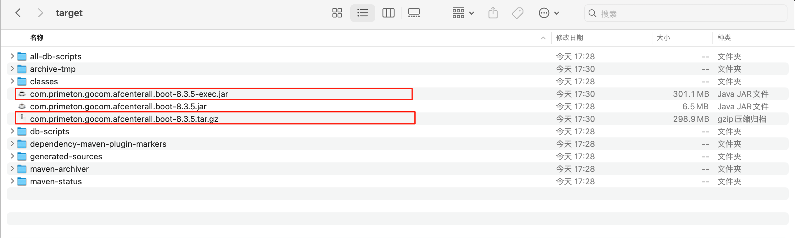 开发调试通过后,可在本地执行maven的clean、install操作(同步骤3),编译后的afcenter依赖会生成到maven仓库中,使用打包框架afcenterall进行步骤3操作,在boot目录的target文件夹下即可获得打包生成的afcenter的运行jar与项目整包。