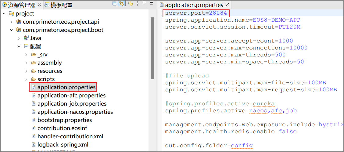注意:端口号不要与其他服务冲突。如果项目创建后发现端口冲突,可以在/project/com.primeton.eos.project.boot/src/META-INF/application.properties中修改端口。![]()