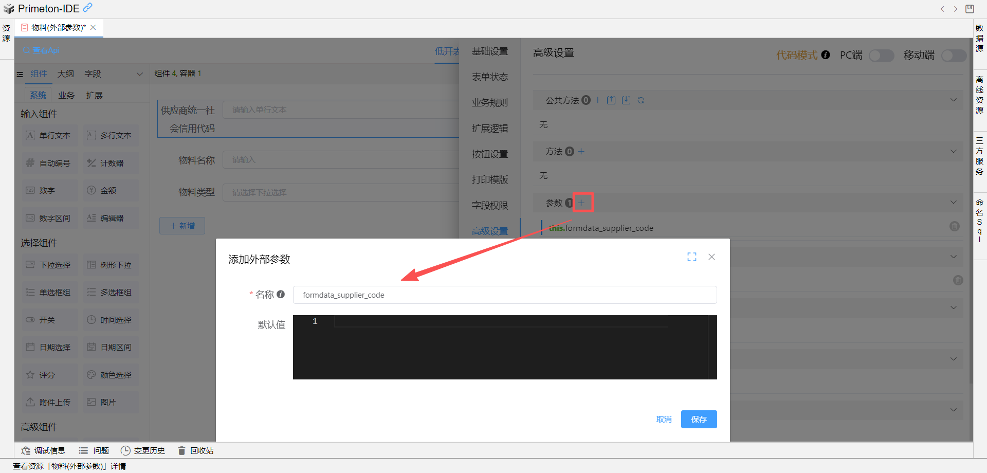 执行代码窗口中,获取父表单(供应商表单)的统一社会信用代码赋值给物料表单中定义的外部参数formdata_supplier_code![]()
