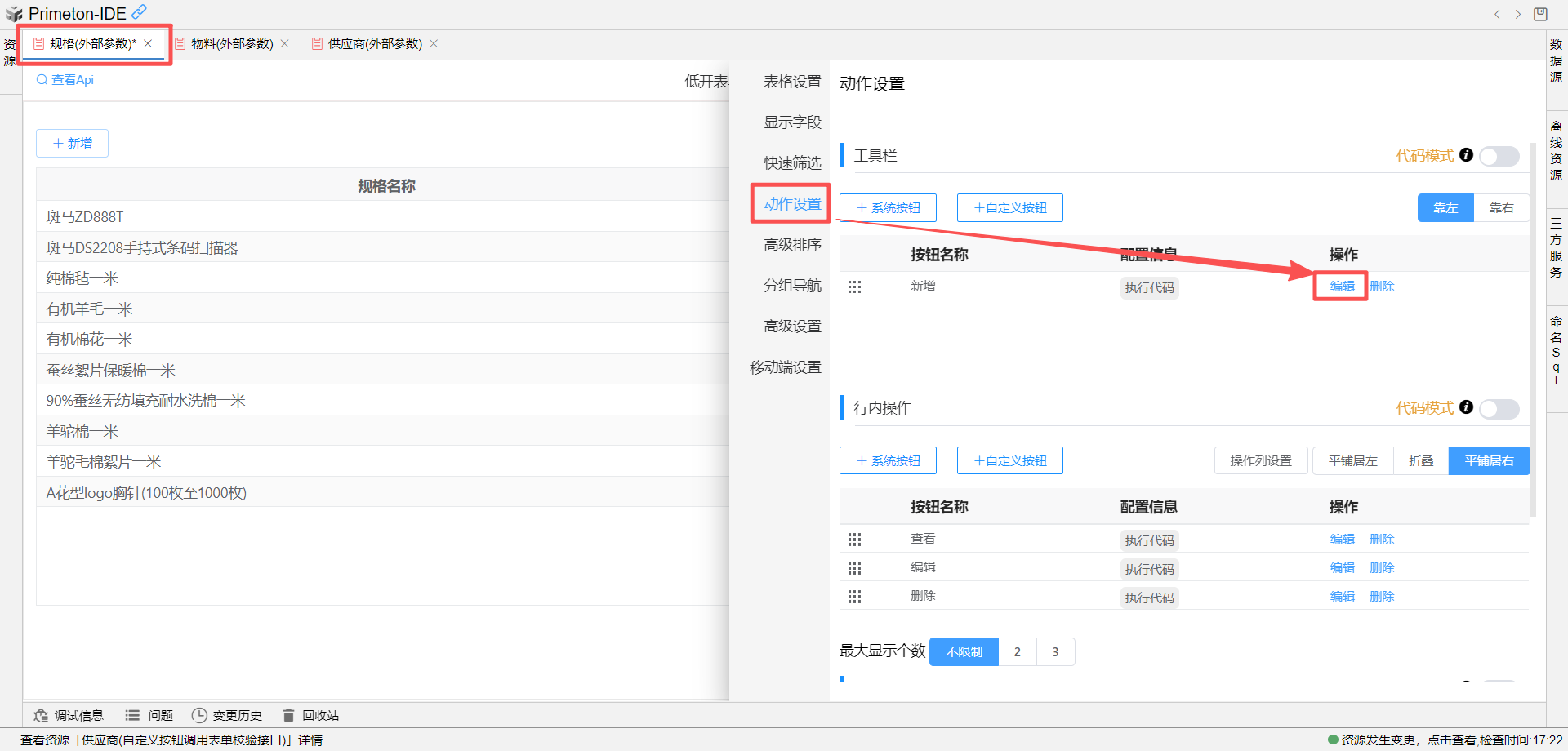 切换到规格默认视图,点击视图设置-动作设置-工具栏-编辑 新增按钮 的配置,在