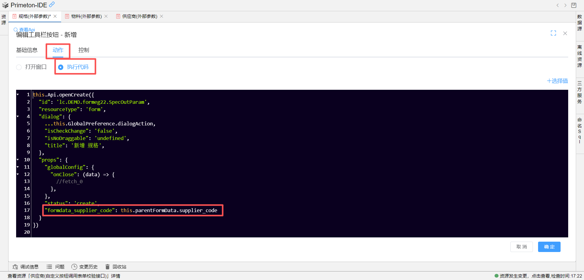 执行代码窗口中,获取父表单(物料表单)的供应商统一社会信用代码赋值(this.parentFormData.supplier_code)给规格表单中定义的外部参数formdata_supplier_code