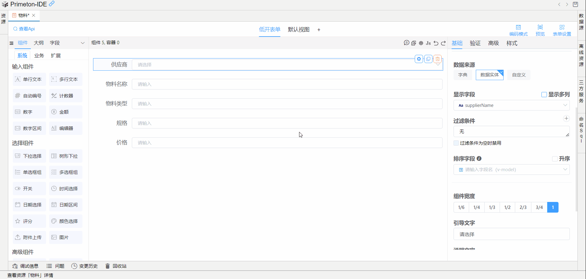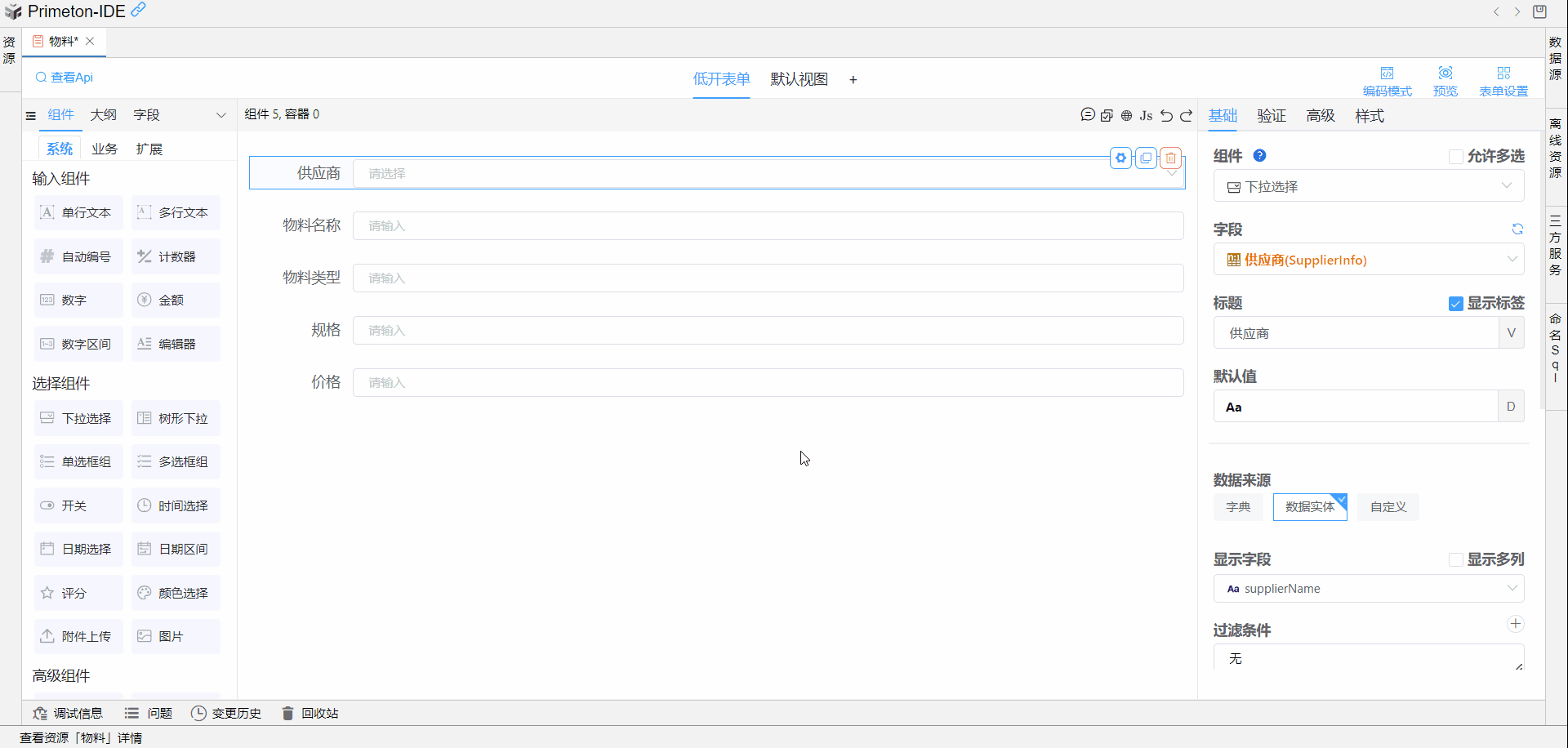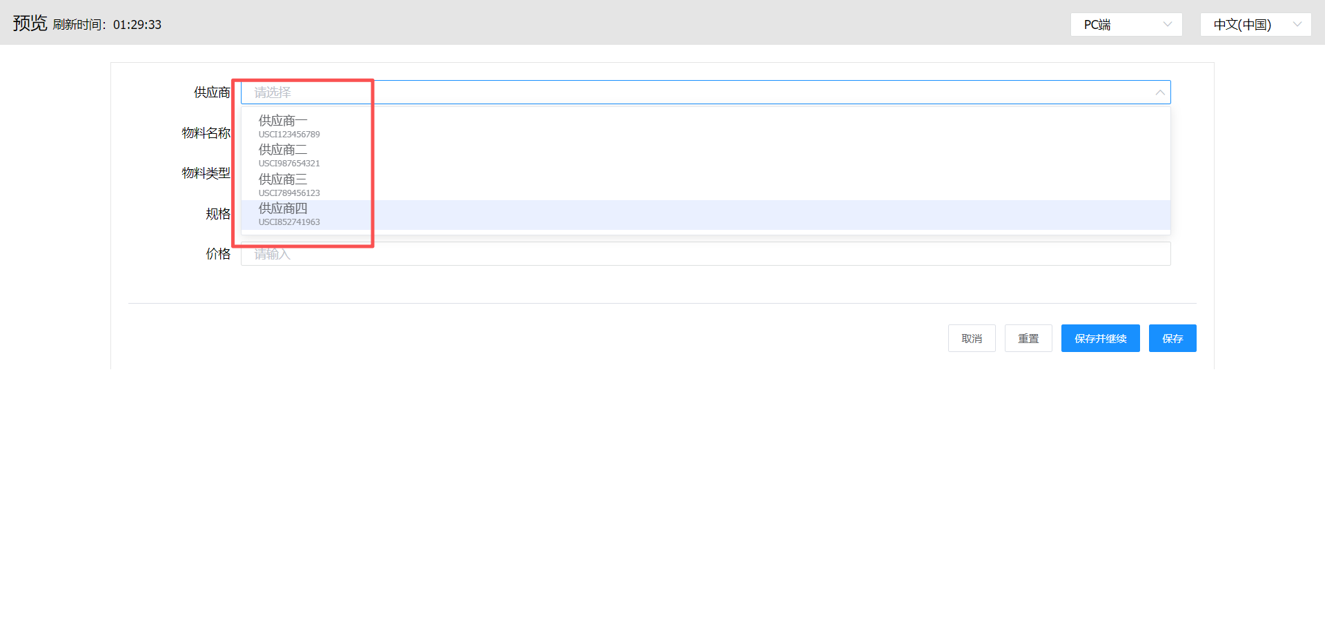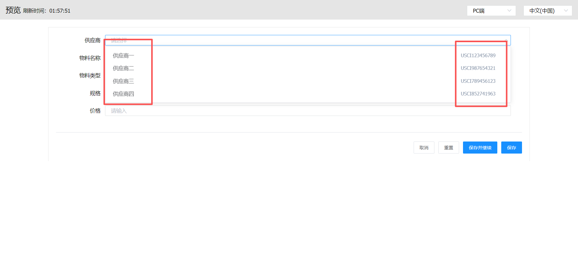 在物料与供应商关联的表单中,供应商下拉组件可以同时显示供应商名称和供应商统一信用代码。