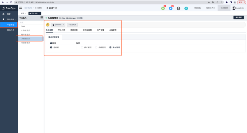 2)给sysadmin添加权限,添加所有权限。包括平台权限,项目权限,项目群权限里的菜单权限,数据权限,按钮权限。