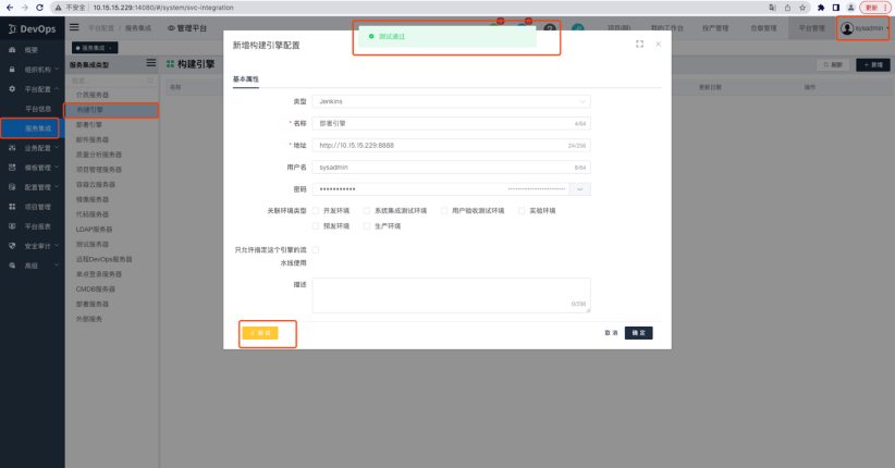 3)构件引擎配置(jenkins) 平台管理->服务集成->构建引擎
