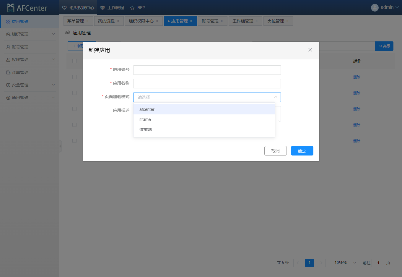 在运行的项目上,应用管理/新建应用,页面加载模式选择'afcenter