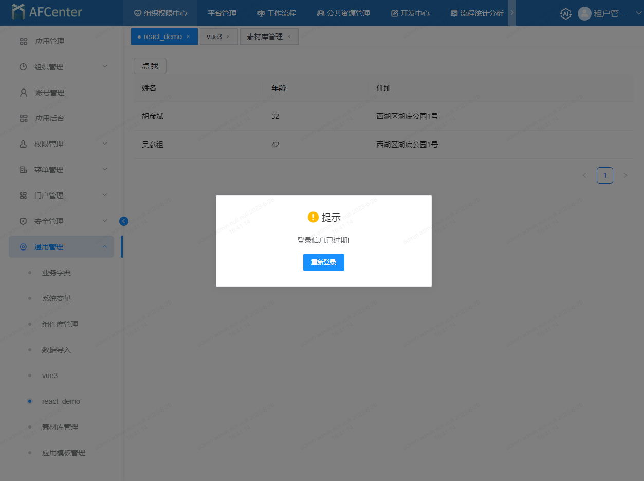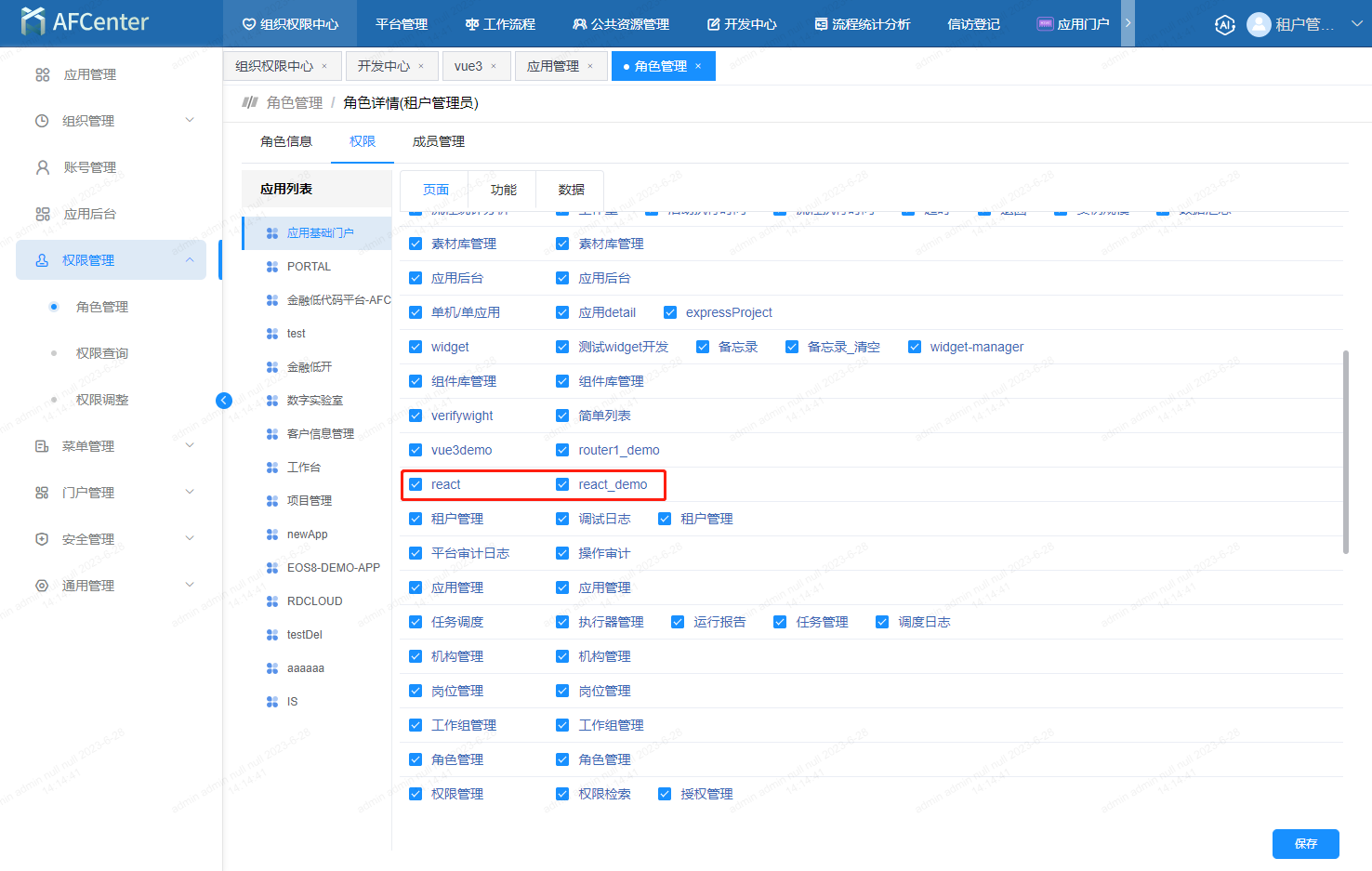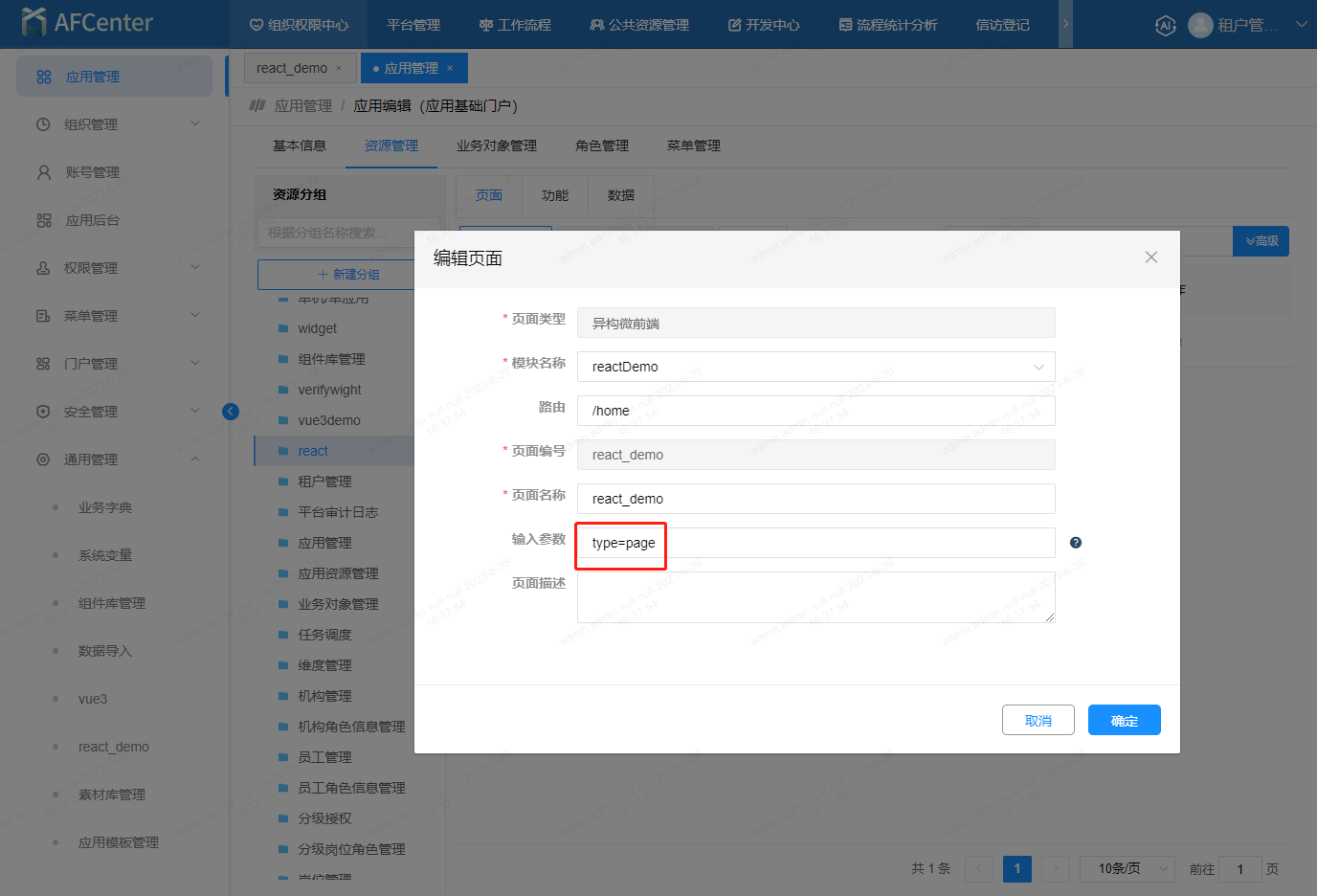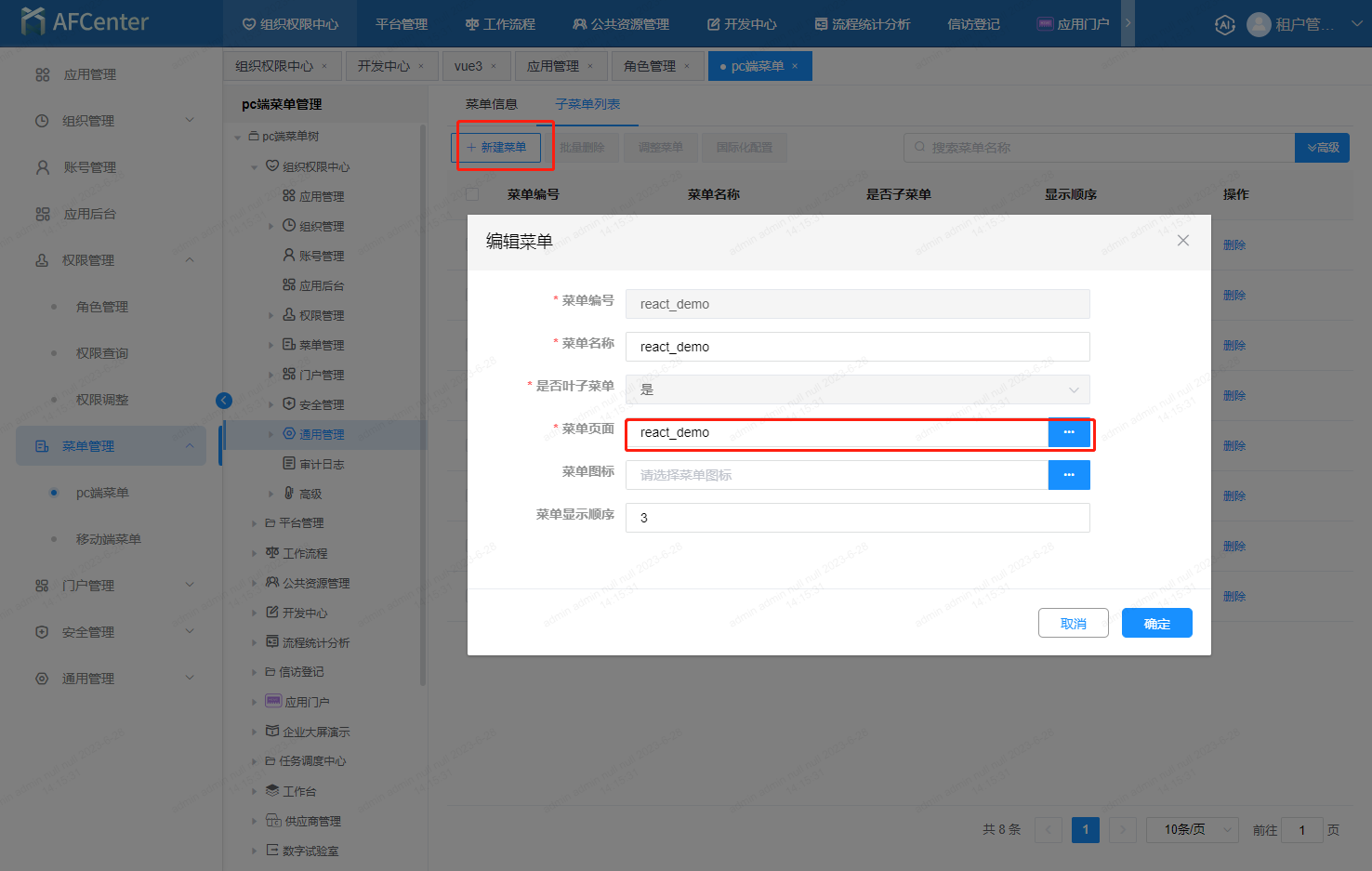 这里列举两个异构微前端页面挂载在afcenter菜单中展示的操作步骤,vue3和react类型项目。