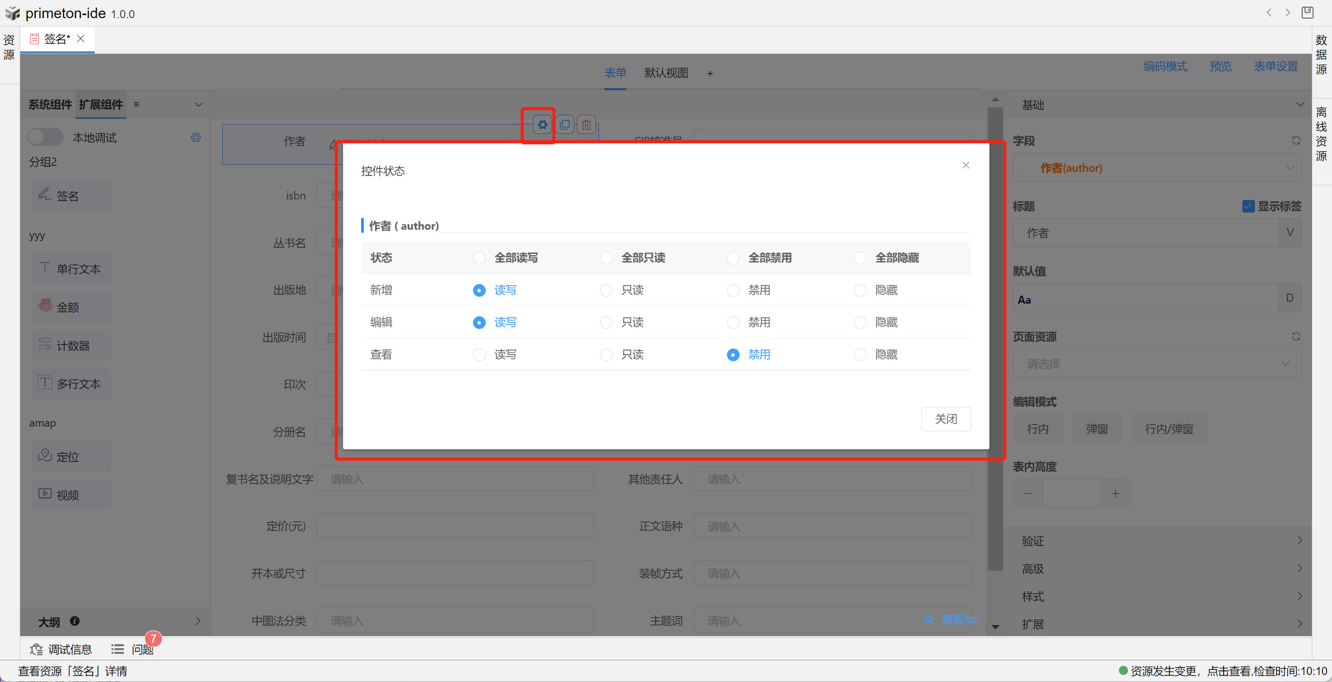 在表单编辑区中,鼠标悬停在组件上,右上角会出现配置按钮,点击设置状态图标进行状态配置