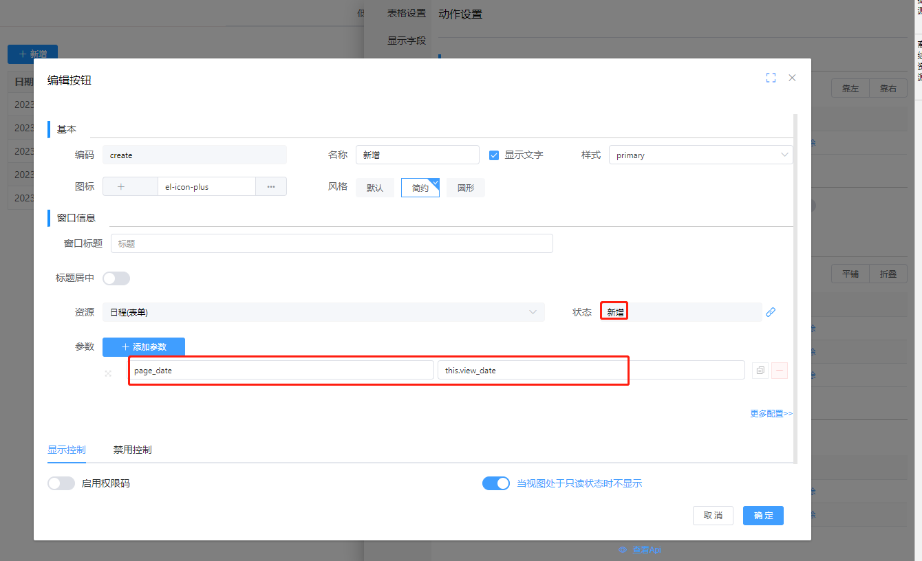 - 在视图下,给视图设置新建参数view_date,并在动作设置处的添加新增按钮添加参数page_date