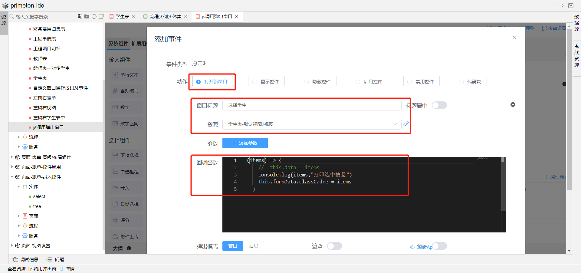 3.在子表格组件上方拖入一个按钮组件放入,按钮文字修改为添加班干部,选择按钮高级属性,添加按钮点击时事件,打开点击时事件设置弹窗,动作选择打开窗口,修改标题为选择学生,资源绑定刚刚创建的学生信息视图,在回调函数中写入如下js代码,即可在打开的选择学生信息列表选择后关闭弹窗将信息回填至表单子表格中。