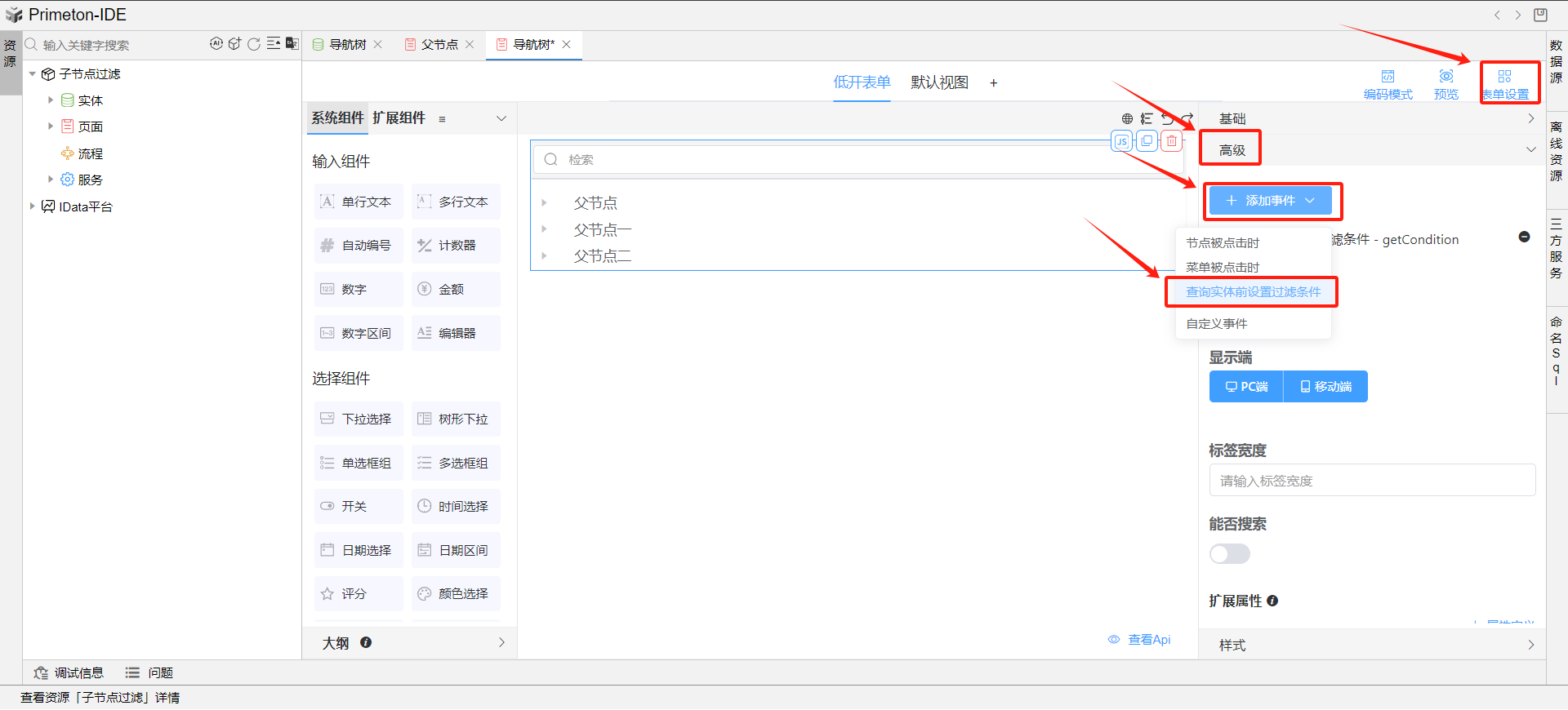 导航树高级-添加事件-查询实体前设置过滤条件,对data解构赋值,然后节点类型是否为子节点,并添加条件。