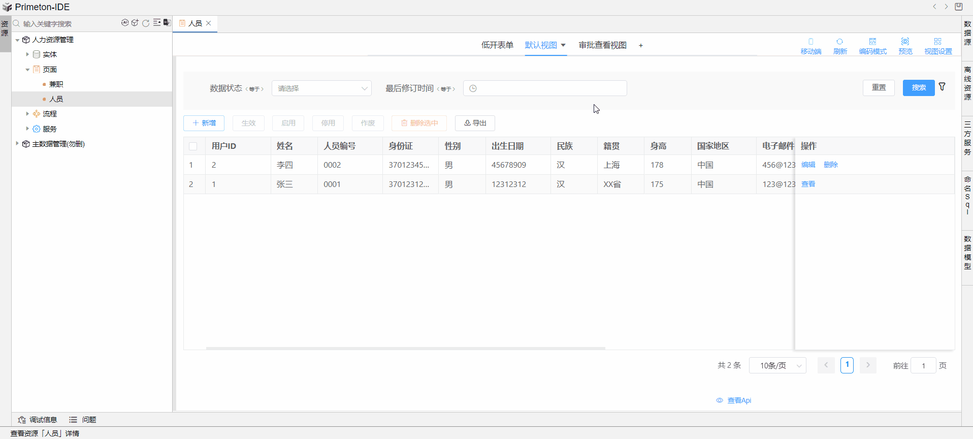 打开页面中人员默认视图,视图设置-动作设置-+自定义按钮,编辑修改名称等按钮信息。