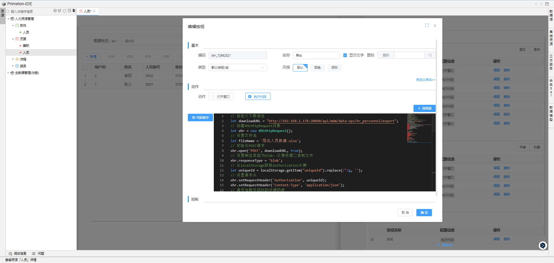在低开与主数据结合使用的场景下,低开提供的导出按钮,无法导出主数据模型的数据,需要自定义导出按钮去实现。