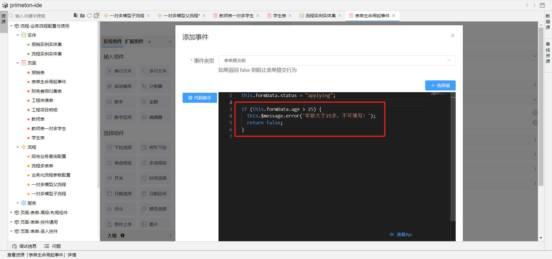 使用场景:提交前校验填写人年龄是否大于25岁,大于25岁提示不可提交并取消提交操作。
