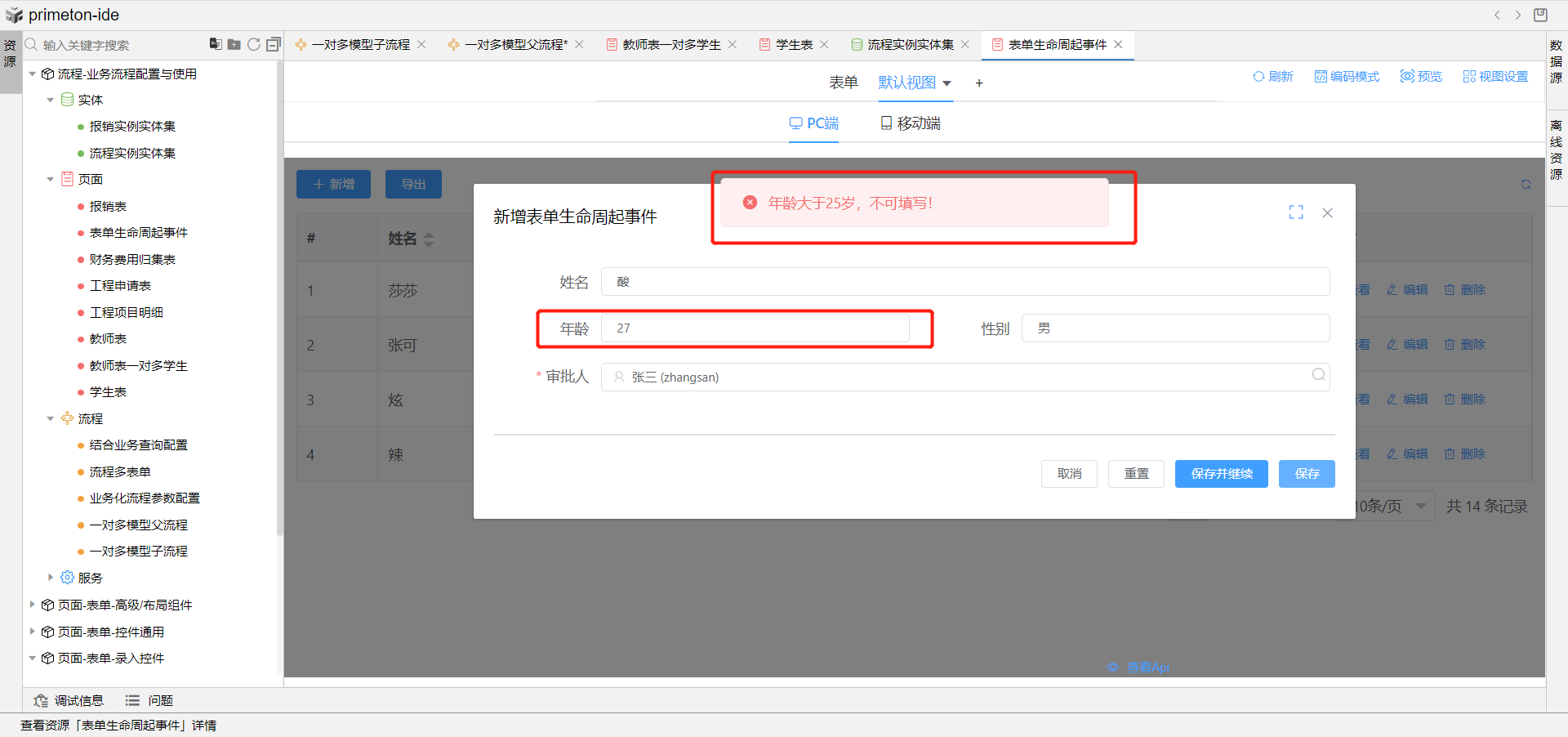 2.切换到视图页面,新增数据,填写年龄大于25后点击保存即可看到提示效果,并且没有触发保存操作。