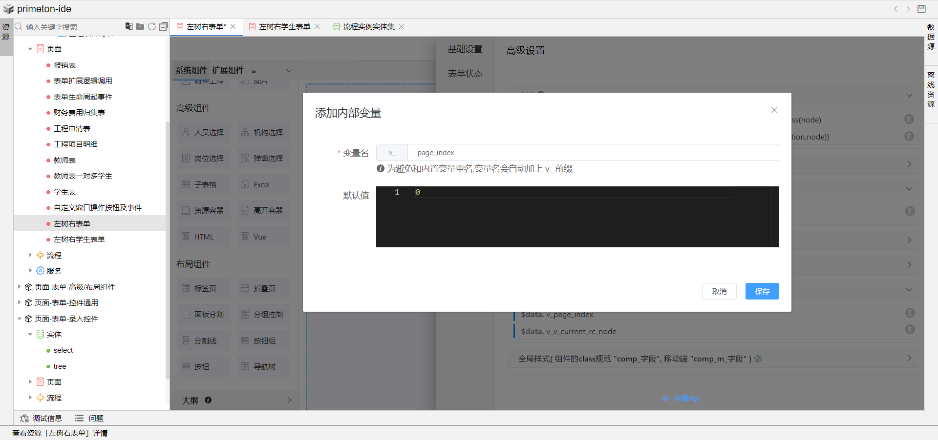 2.再次使用教师持久化实体创建一表单用于作为左树右表单页面,拖选面板分割组件到表单编辑器中,设置左面板宽度为1/4。