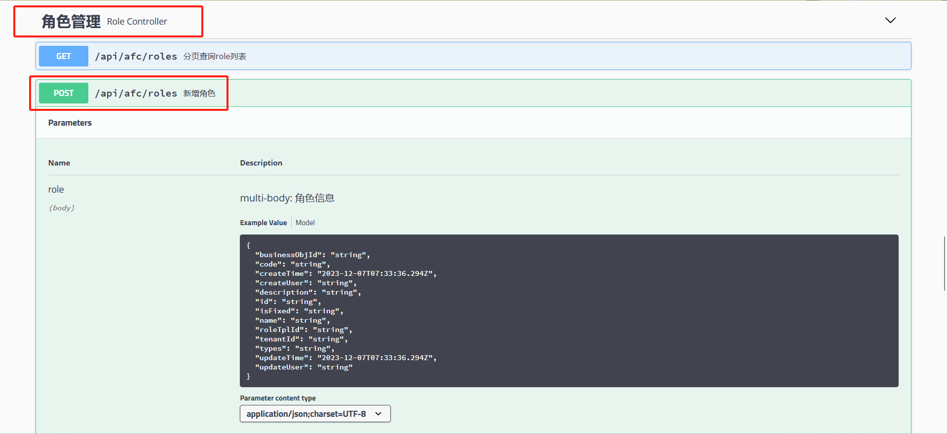 通过swagger接口文档,获取AFCenter的“角色管理-新增角色”的API接口。文档地址: