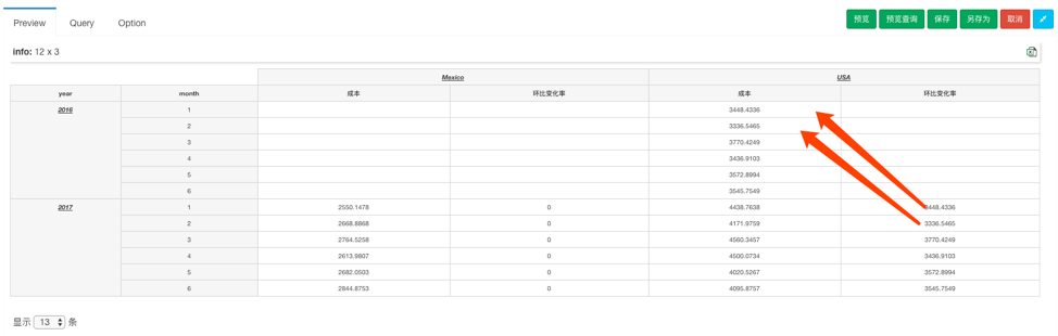 值类型一栏不选即可), 从下图可以看出, 原来的成本列相对于原始值在列上有滞后量为 1 行的错位(滞后量可自行调节, 可正可负)