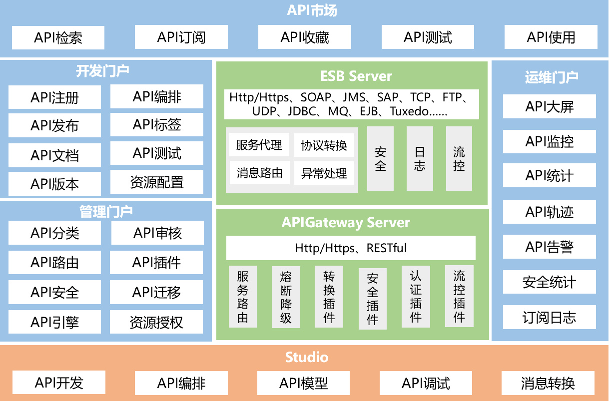Portal提供API门户、开发门户、管理门户、运维门户四大门户,实现对API的全生命周期管理。