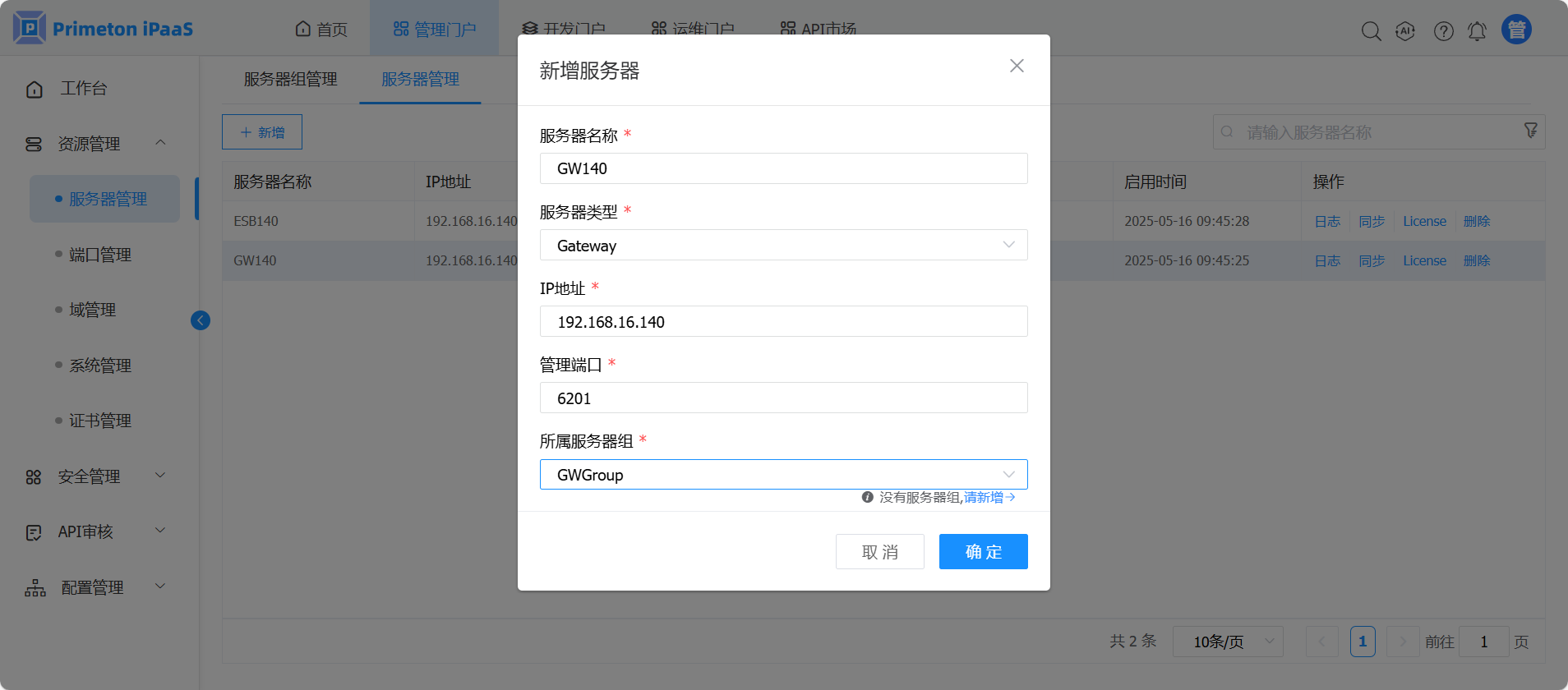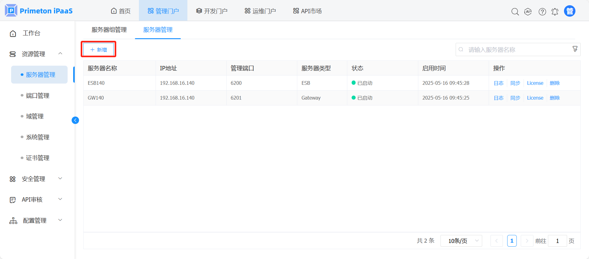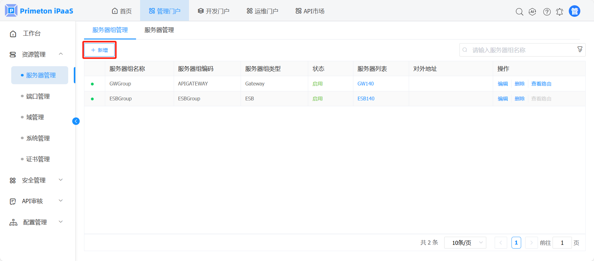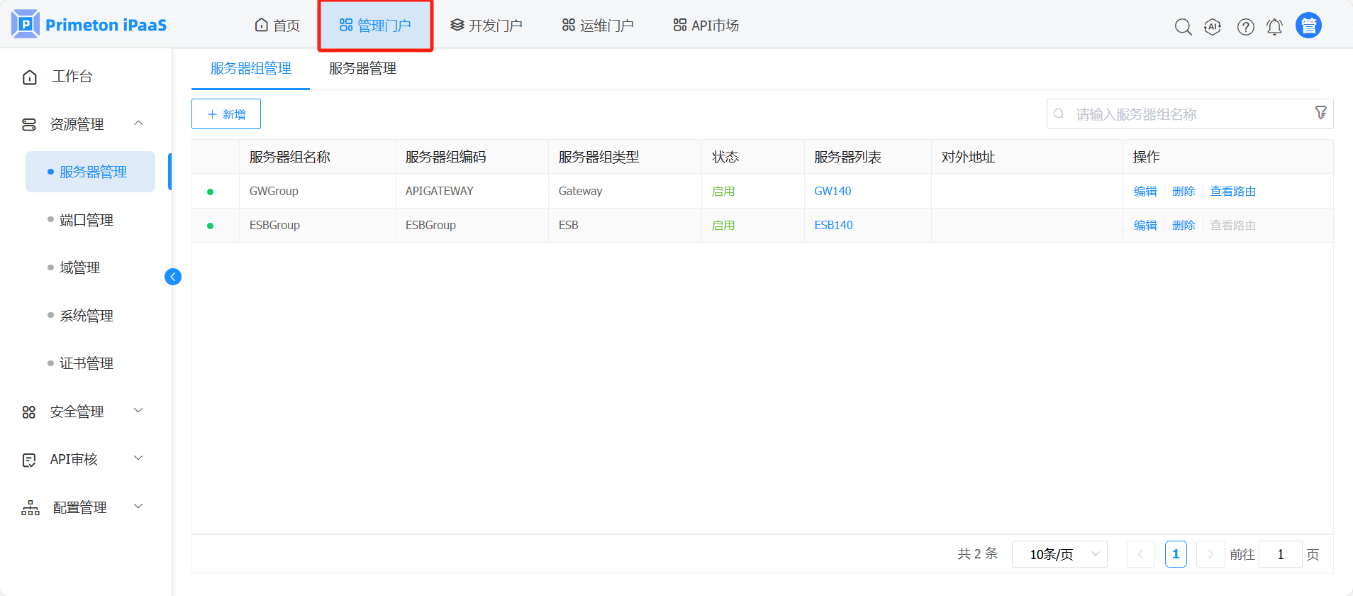 使用manager账号(默认密码:000000)登录系统,单击"管理门户->资源管理->服务器管理",进入服务器组及服务器管理页面。
