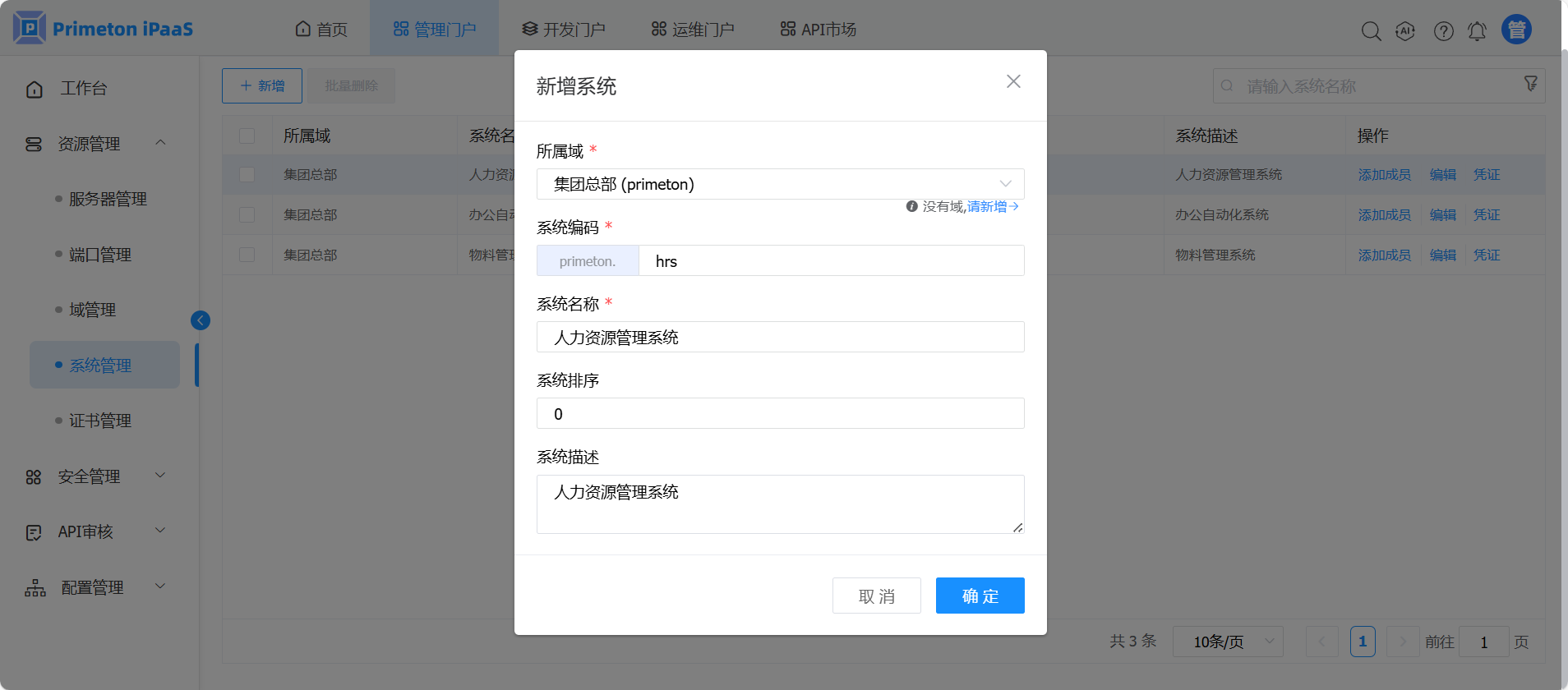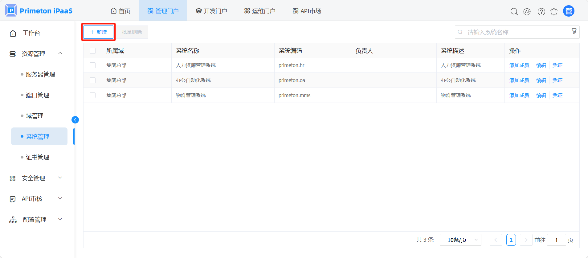 单击"管理门户->资源管理->系统管理",右侧显示系统管理界面,点击“新增”按钮,进入“新增系统”界面。