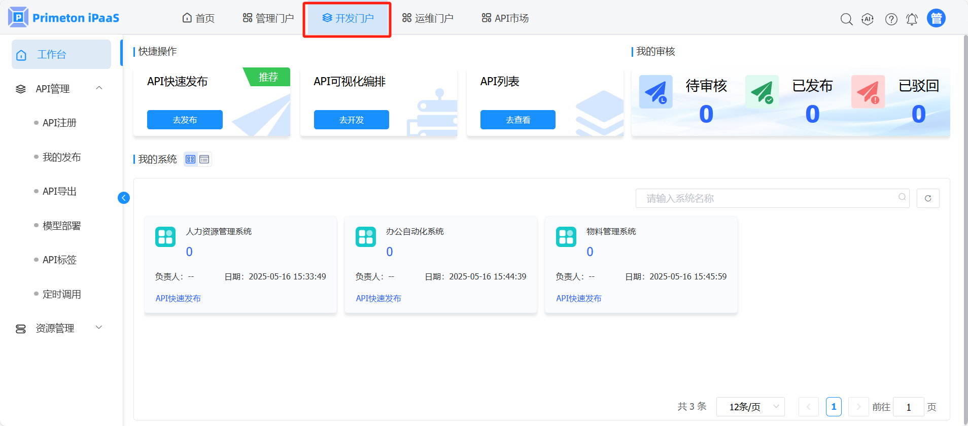 在完成创建服务器组、创建服务器、创建域、为域分配服务器组、创建系统这些操作后,单击“开发门户”,进入开发门户工作台。