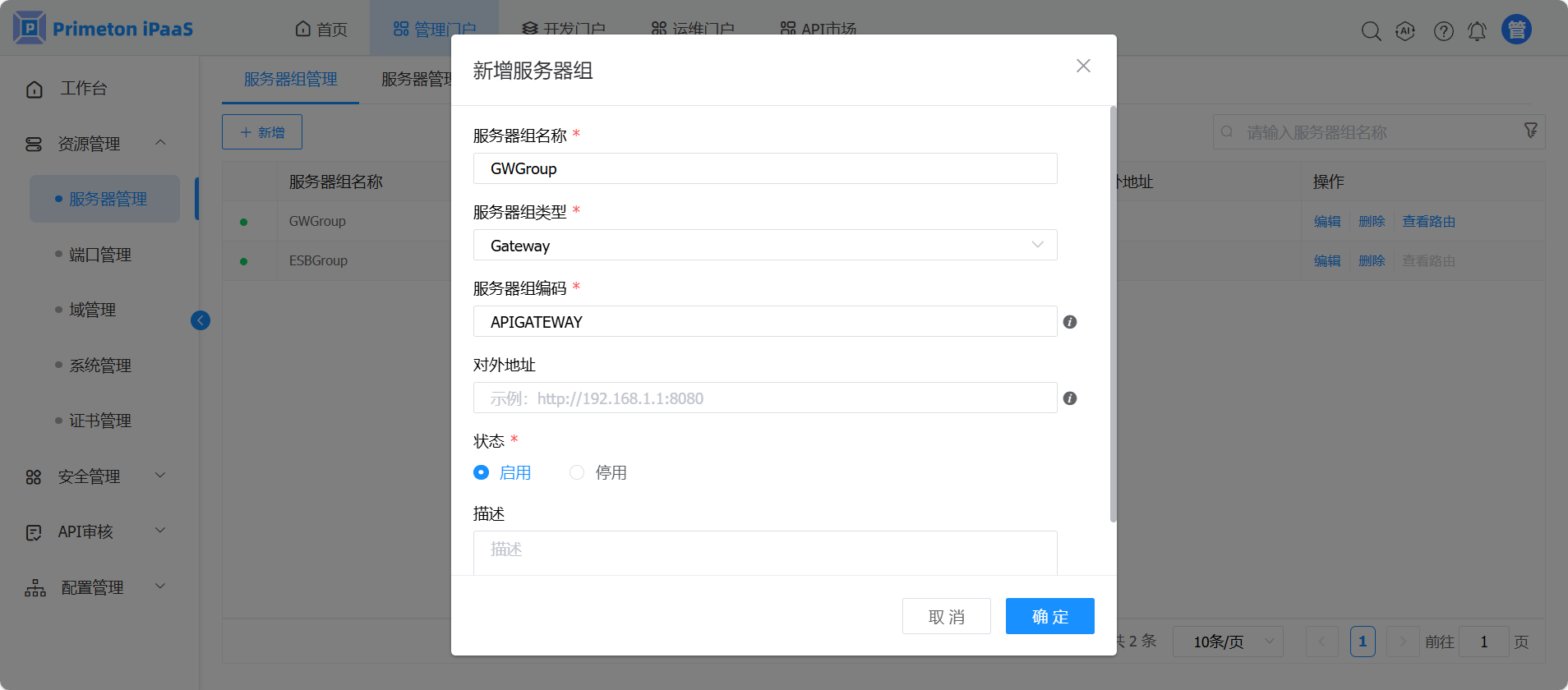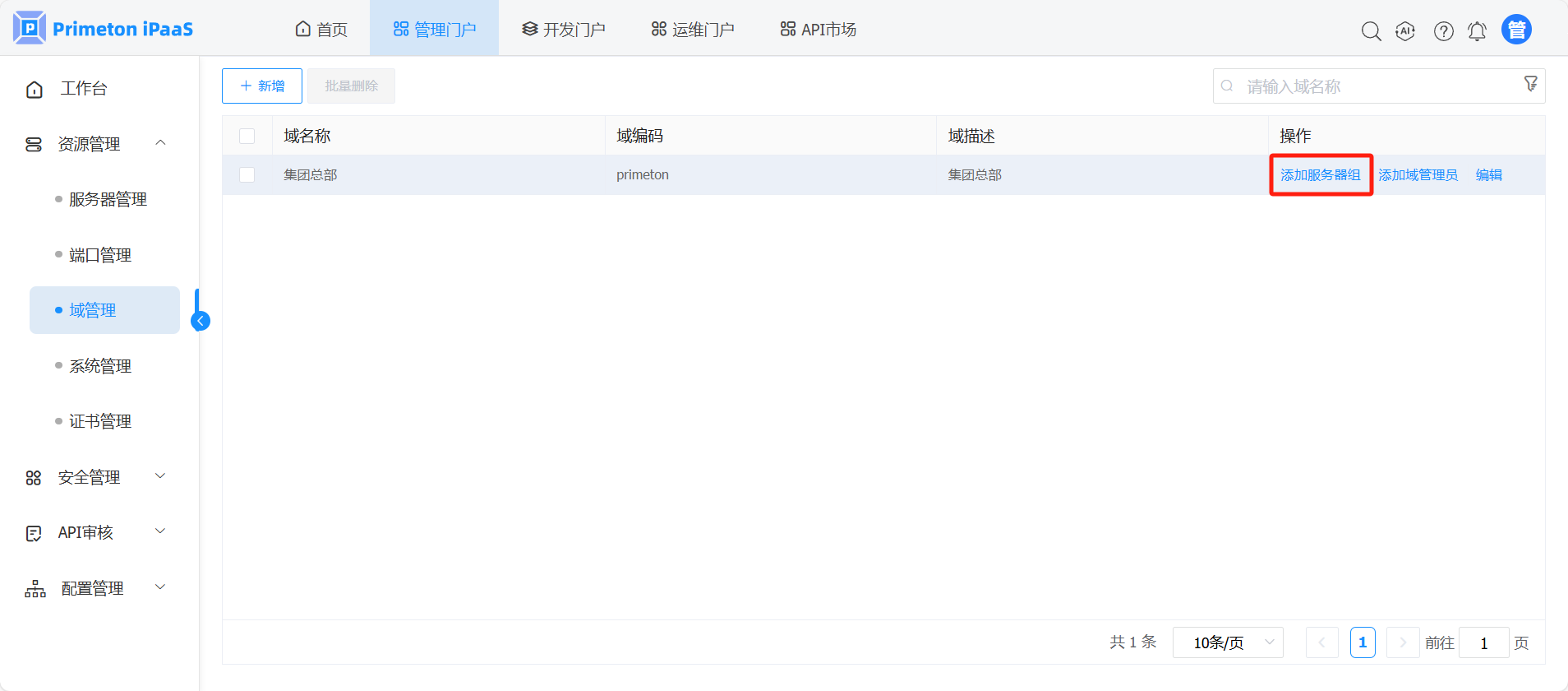 只有给域分配了可用的服务器组,域下的接口在发布时才能选择服务器并进行正常的接口发布操作。若新增域时未关联服务器组,则可在域创建后,在域展示列表中选择需要关联服务器组的域,在操作列点击“添加服务器组”按钮,弹出添加服务器组页面。