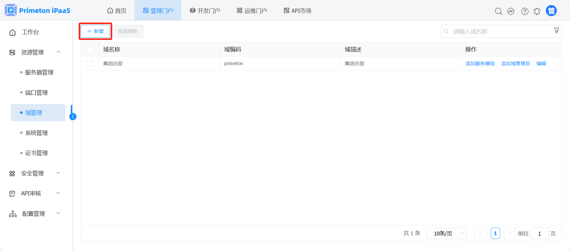 单击"管理门户->资源管理->域管理",右侧显示域管理界面,点击“新增”按钮,弹出新增域界面。