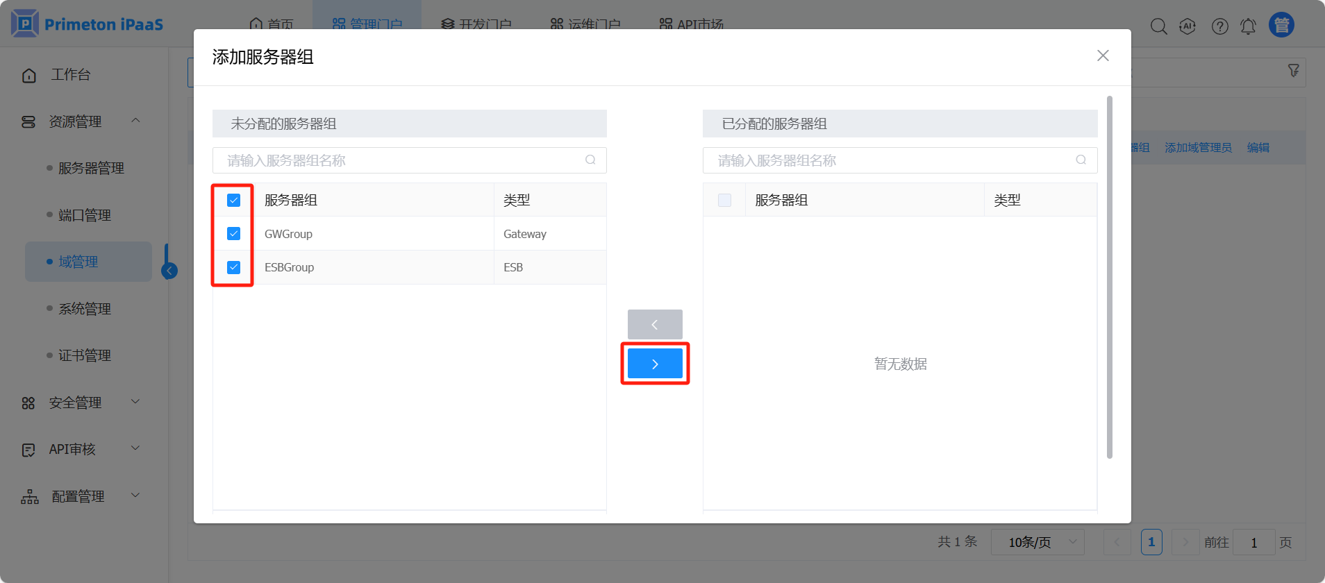 在左侧选择未分配的服务器组,点击“>”按钮,为域分配服务器组,每个域下的接口只能发布到已分配的服务器组。