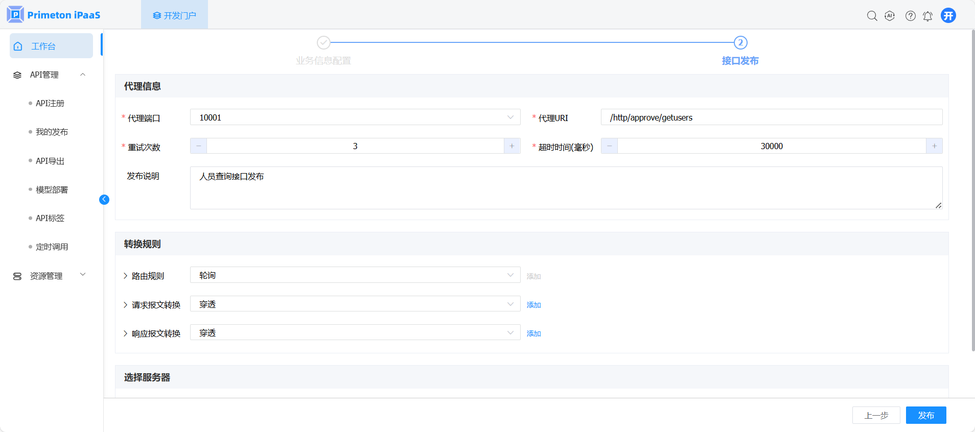 参数 说明 代理端口 ESB Server代理API的端口 代理URI ESB Server代理API的URL,比如:/test或/api/test 重试次数 重试次数,默认3 超时时间(毫秒) 请求超时时间,默认3000 发布说明 该接口发布说明 路由规则 根据条件判断是否对请求进行路由转发,可选“轮询”或“自定义”,默认“轮询”,无需修改 请求报文转换 对请求报文格式进行转换,可选“穿透”、“XML转JSON”、“JSON转XML”,默认“穿透”,无需修改 响应报文转换 对响应报文格式进行转换,可选“穿透”、“XML转JSON”、“JSON转XML”,默认“穿透”,无需修改 发布至网关服务器 是否将该接口发布至网关服务器,默认不勾选 ESB服务器 选择ESB服务器组,发布接口 接口发布后,点击“开发门户”,进入“API管理>我的发布”页面,查询上一步发布的接口,接口状态是“发布中”,接口的审核状态是“未审核”。