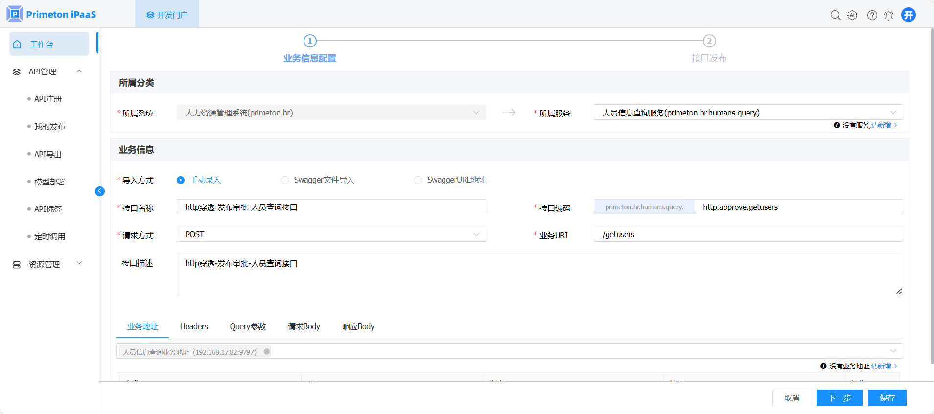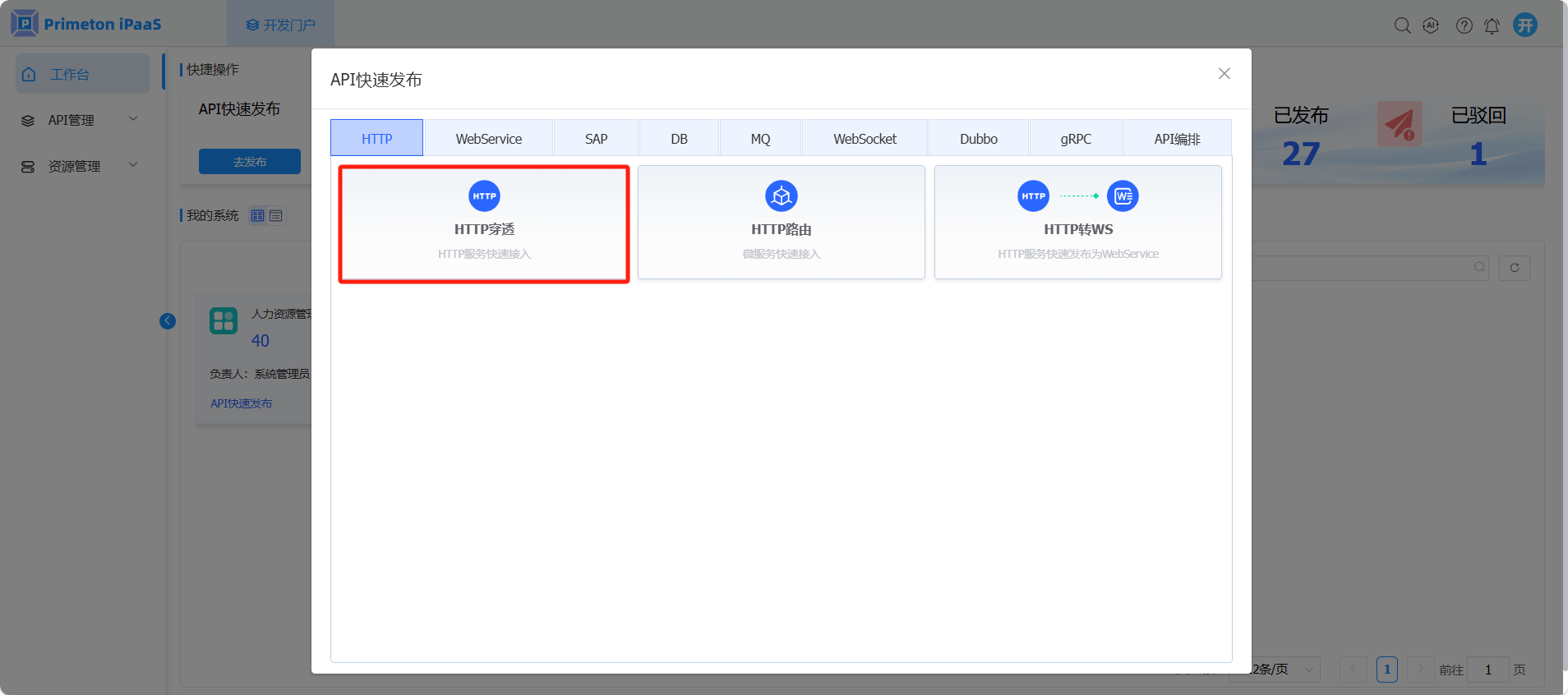 使用账号 developer(默认密码:000000)登录系统,点击开发门户,进入“工作台”页面,创建HTTP穿透接口,参考 [2.1.1-HTTP穿透-手动录入] 。