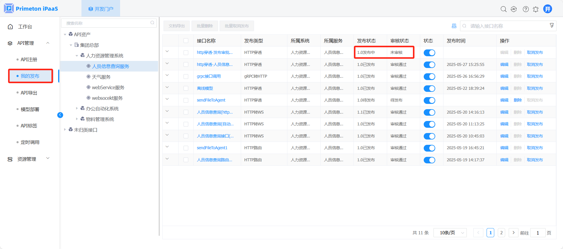 使用账号 developer(默认密码:000000)登录系统,点击开发门户,进入“API管理>我的发布”页面,查询接口信息。