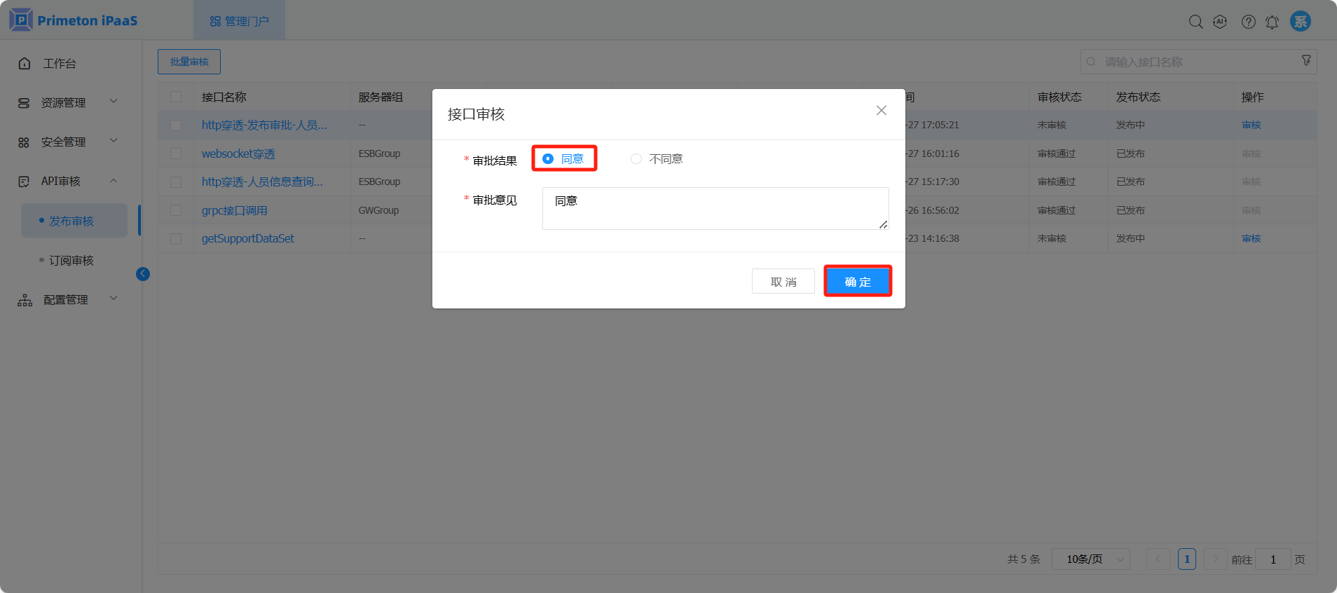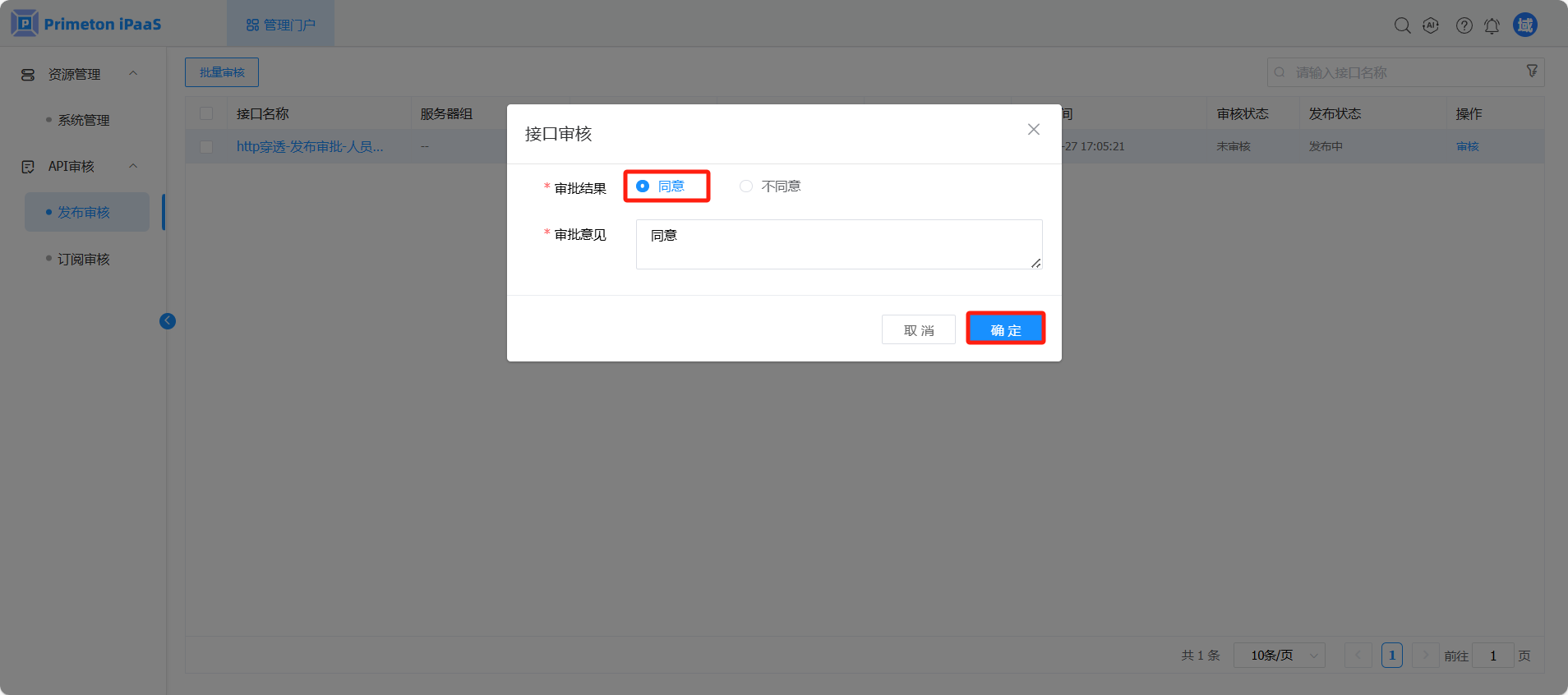 选择“同意”,输入审批意见,然后点击“确定”按钮,同意开发人员发布该接口。