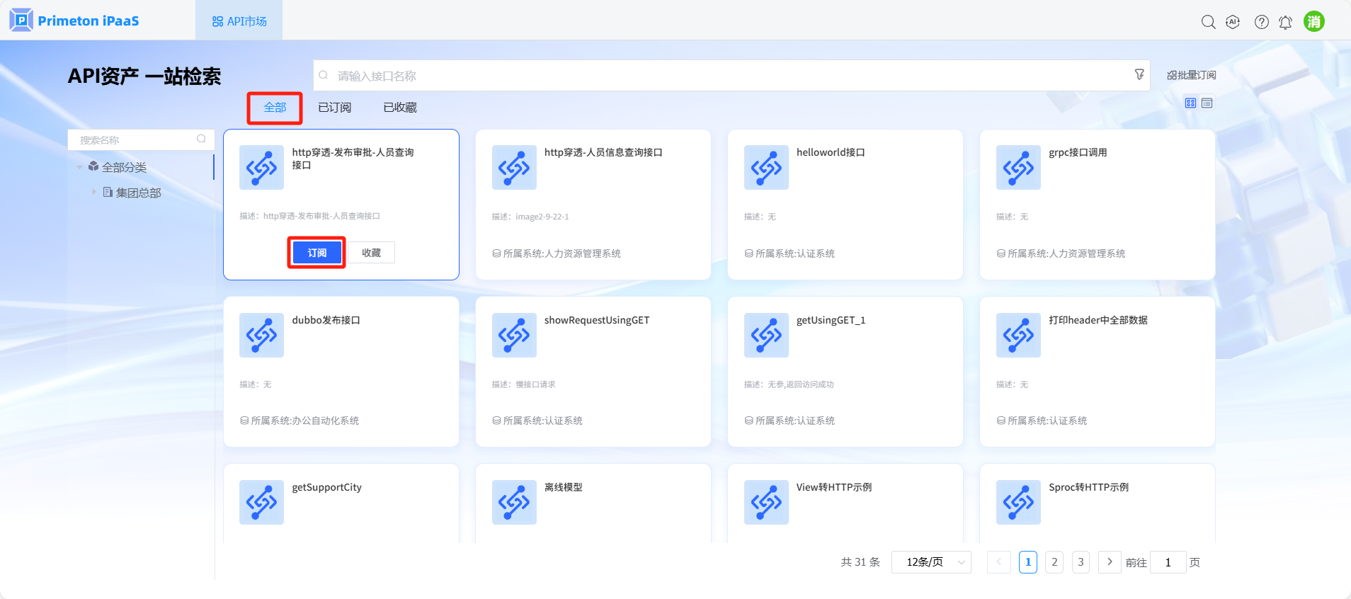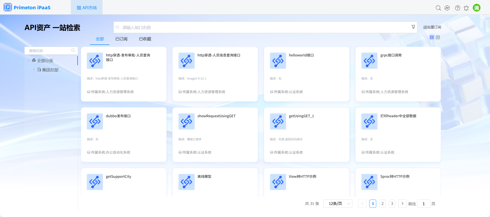使用账号 consumer(默认密码:000000)登录系统,点击API市场,进入API市场页面。