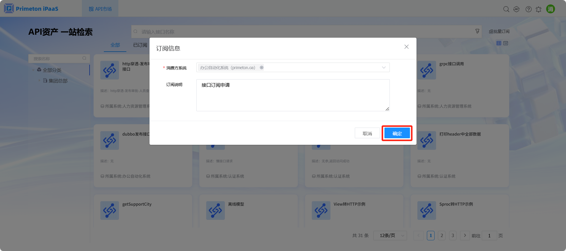 3 在接口订阅申请页面,选择消费方系统,输入订阅说明,然后点击“确定”按钮发起接口订阅审批流程。