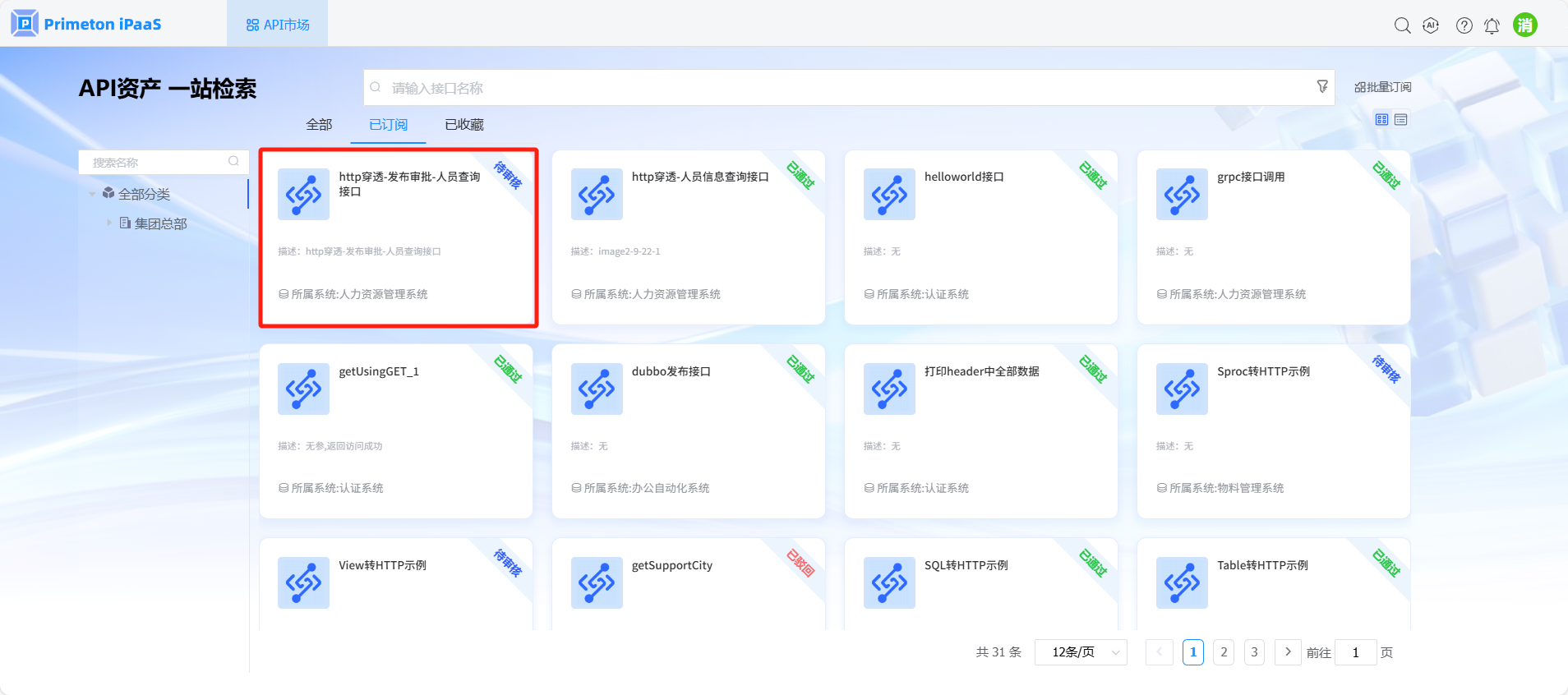 保存成功,进入“已订阅”页签,查看上一步订阅的接口,审核状态是“待审核”。