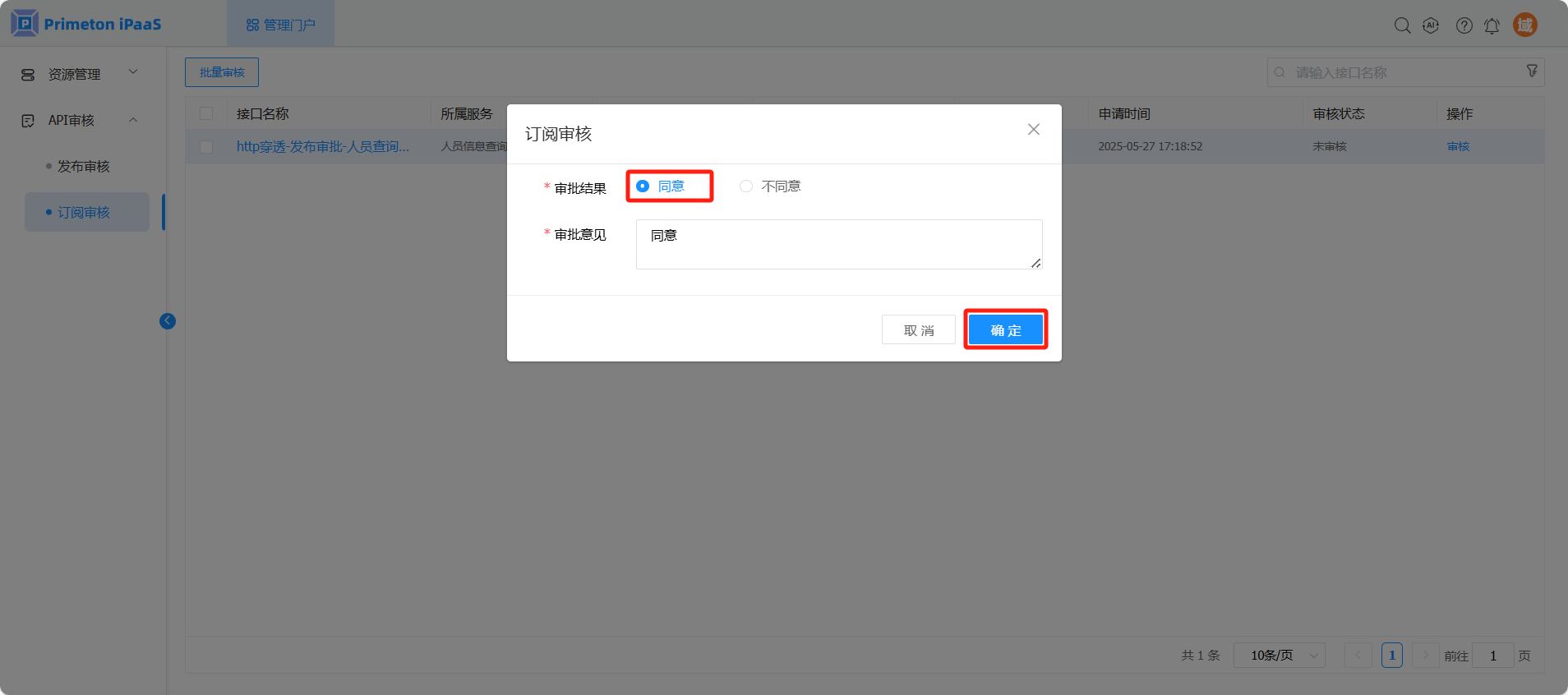 在接口订阅审核页面,选择“同意”,输入审批意见,然后点击“确定”按钮,同意消费方订阅该接口。
